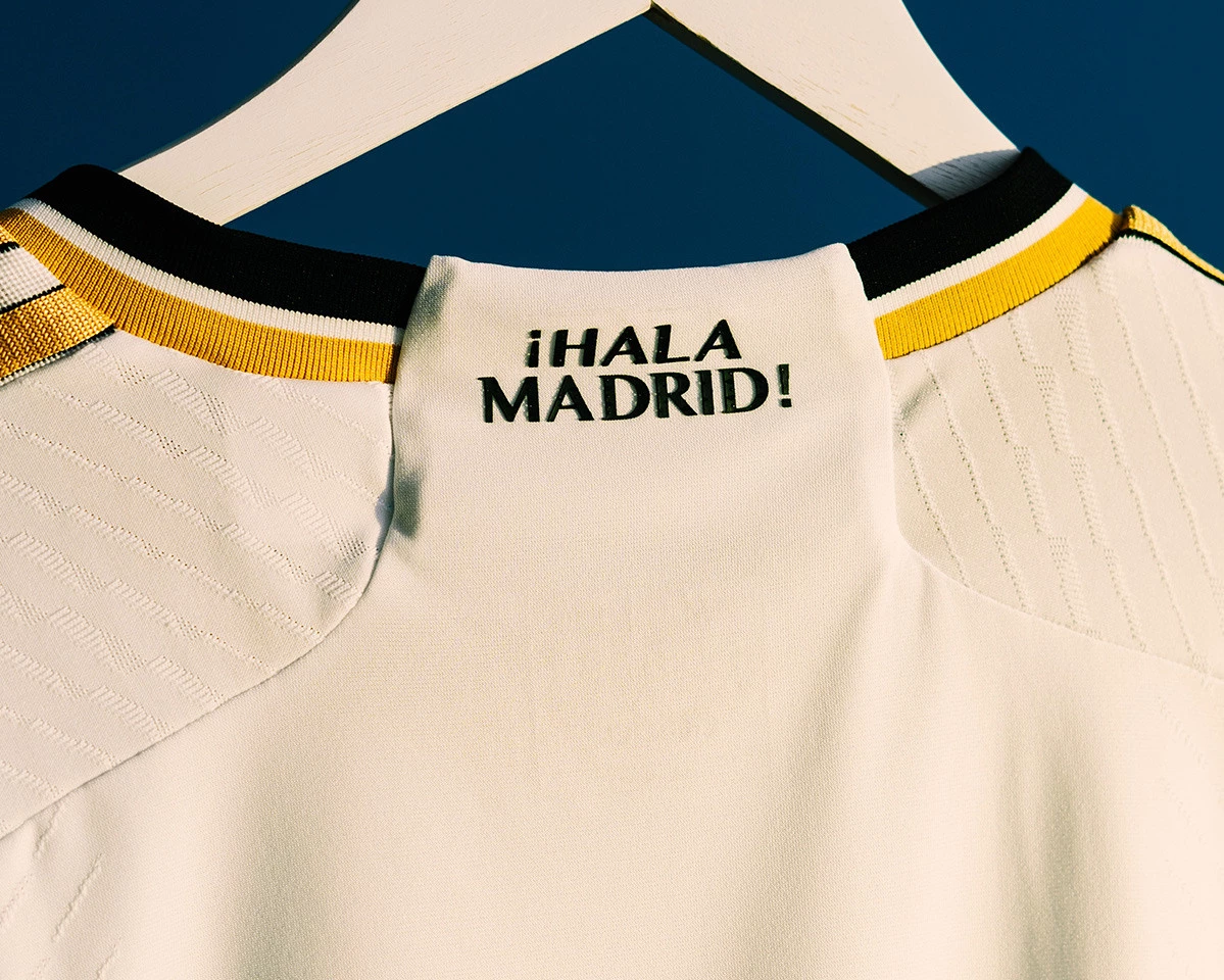 Quanto aos detalhes, o mais importante encontra-se na parte de trás, à altura da gola. Nesta zona da nova camisola do Real Madrid podemos ler o famoso grito de guerra do clube branco, “¡HALA MADRID!”, escrito numa tipografia que se encaixa perfeitamente no design elegante e sóbrio da nova camisola do clube da capital de Espanha.