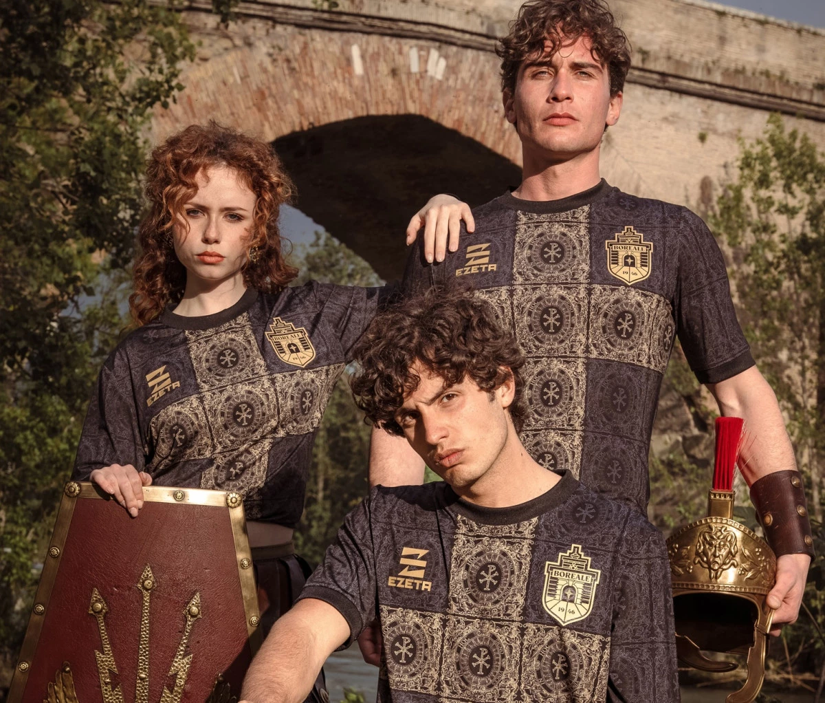 Começamos pela do “Home kit”, que faz referência à batalha da Ponte Mílvia, que ocorreu em 312 d.C. e marcou a vitória de Constantino sobre Magêncio e o triunfo do cristianismo sobre o mundo pagão. Constantino foi um dos grandes imperadores do império romano, e essa é a inspiração por trás do design. O design em campo fica fantástico, e já vimos os primeiros jogos da equipa italiana com esta camisola.