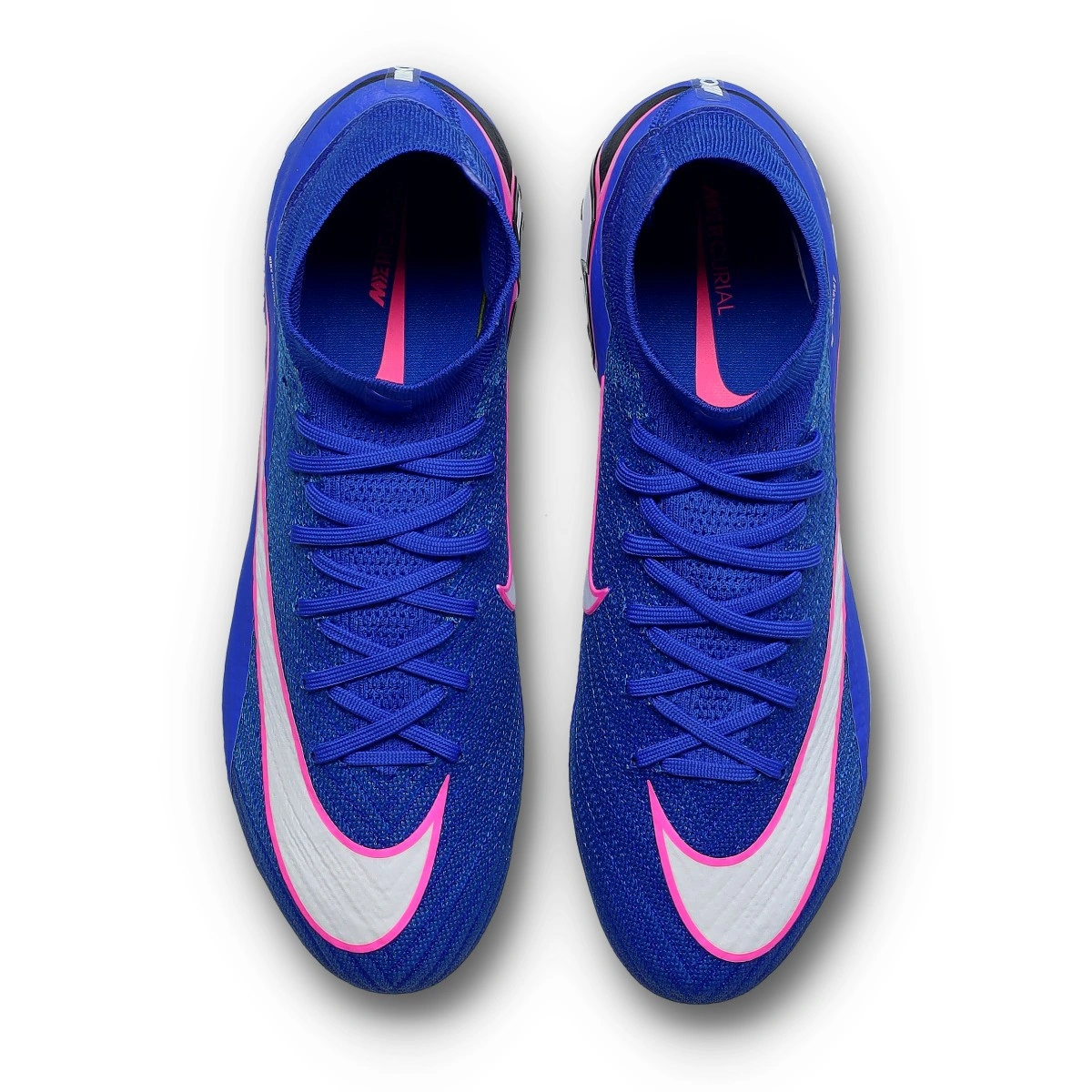 Fußballschuhe Nike Air Zoom Mercurial Superfly 10 Elite SG-Pro für Erwachsene. Schuhe aus Strickmaterial, mit Socke, für den Einsatz auf deutlich nassen Naturrasenplätzen. Hochwertige Schuhe für schnelle Spieler in der Farbe Racer Blue-White.