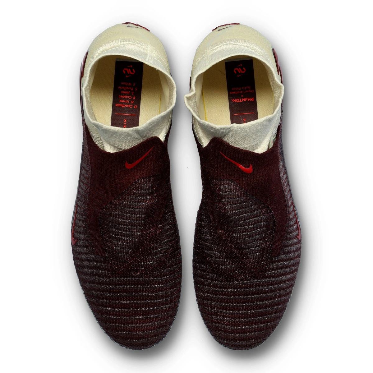 Nike Phantom 6 High Elite Fußballschuhe FG für Erwachsene. Spitzenklasse Fußballschuhe mit Knöchelsocke für Kontroll- und Präzisionsspieler in der Farbe Burgundy Crush-Univ Red-Fossil zur Verwendung auf Naturrasenplätzen.