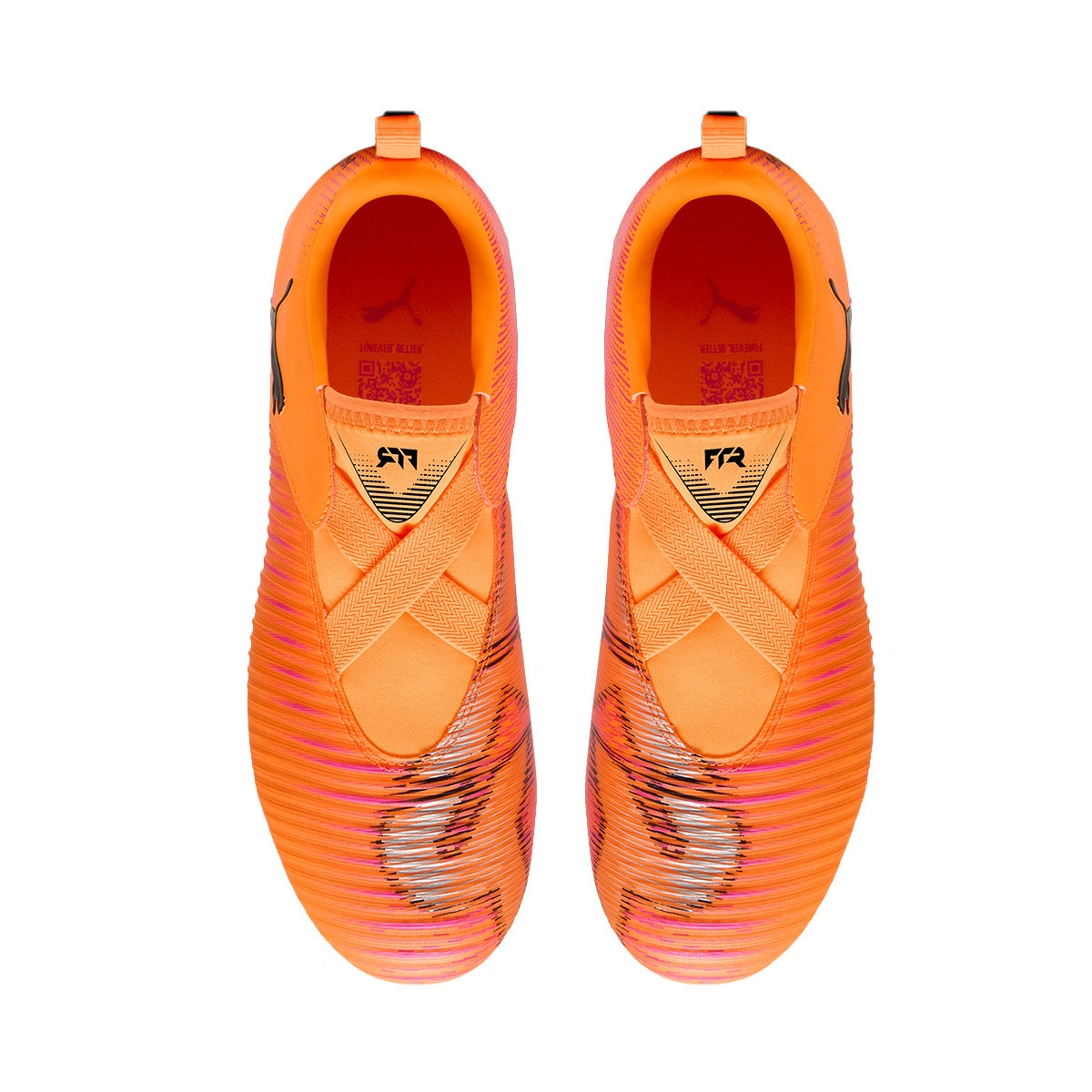 Puma Future 8 Match LL FG/AG Fußballschuh für Kinder. Synthetische Stiefel ohne Schnürsenkel für den Einsatz auf Kunstrasen- und Naturrasenplätzen. Einsteigerstiefel in der Farbkombination Heat Fire-Black-Ravish.