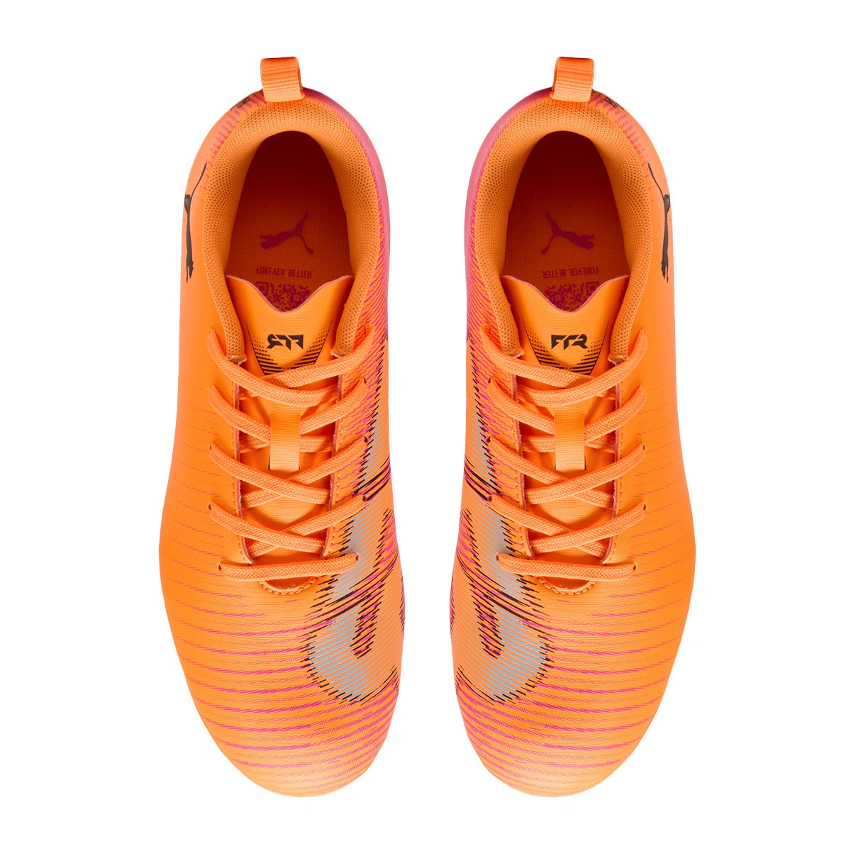 Puma Future 8 Play MG Fußballschuh für Kinder. Synthetische Stiefel für die Verwendung auf Kunstrasenplätzen der zweiten Generation. Stiefel der unteren Preisklasse in der Farbe Heat Fire-Black-Ravish.