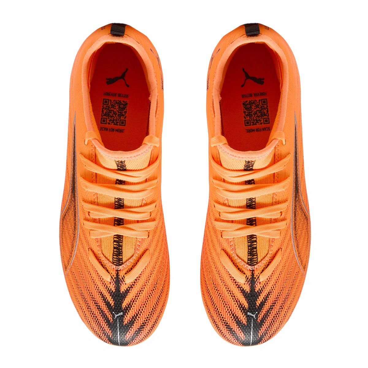 Puma Ultra 6 Match MG Fußballschuhe für Kinder. Synthetische Schuhe für die Verwendung auf Kunstrasenplätzen der ersten Generation. Günstige Schuhe in Heat Fire-Black-Glowing Red.
