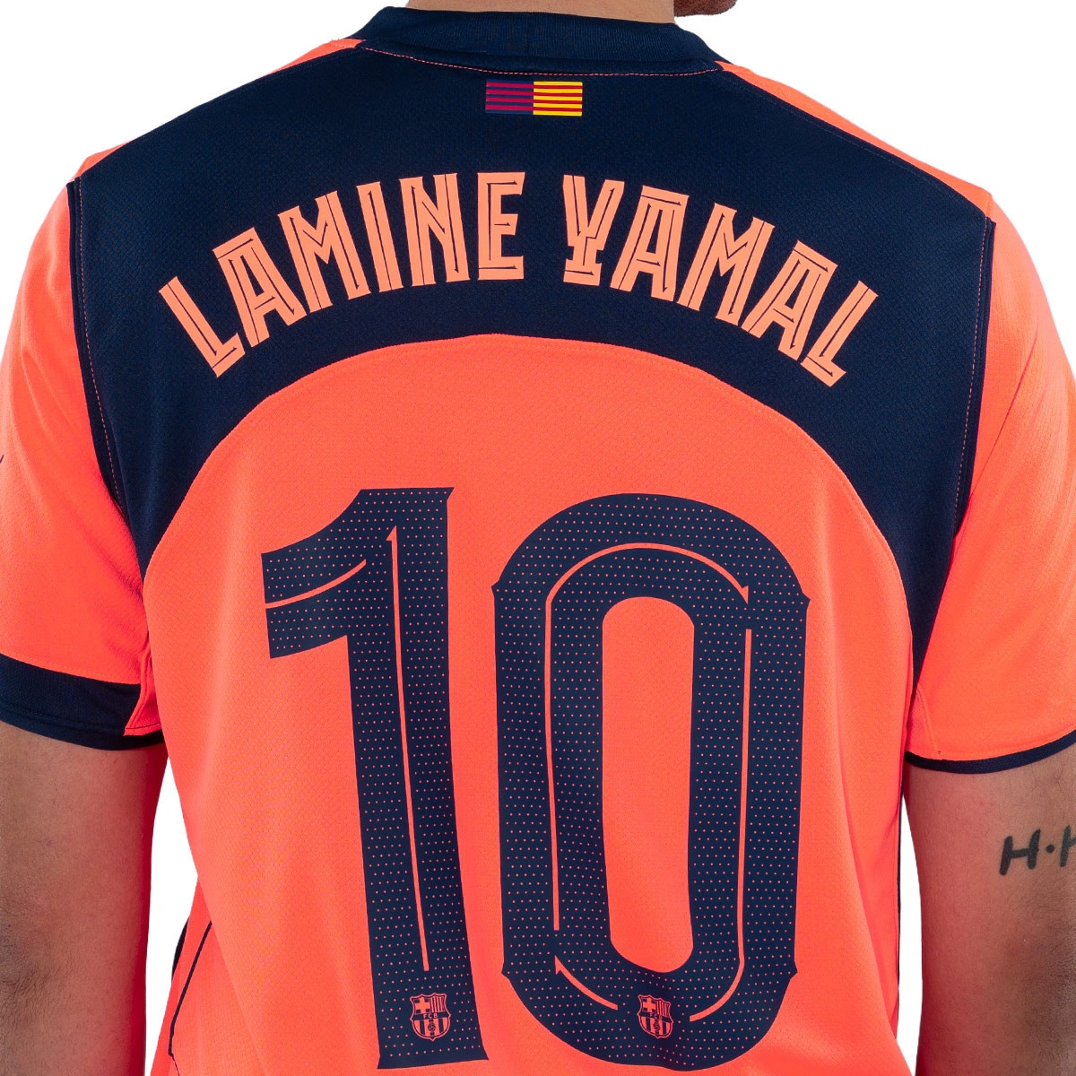 Trage mit Stolz die Farben des FC Barcelona mit dem dritten Trikot für die Champions League 2025-2026, personalisiert mit dem offiziellen Namen und der Rückennummer von Lamine Yamal.