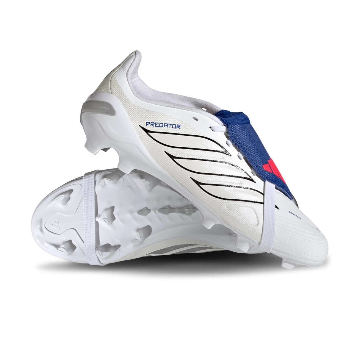adidas Predator League Football Boots FT FG for kids. Synthetic boots with laces for use on natural grass pitches. Entry-level boots in White-Zero Met-Team Royal Blue.