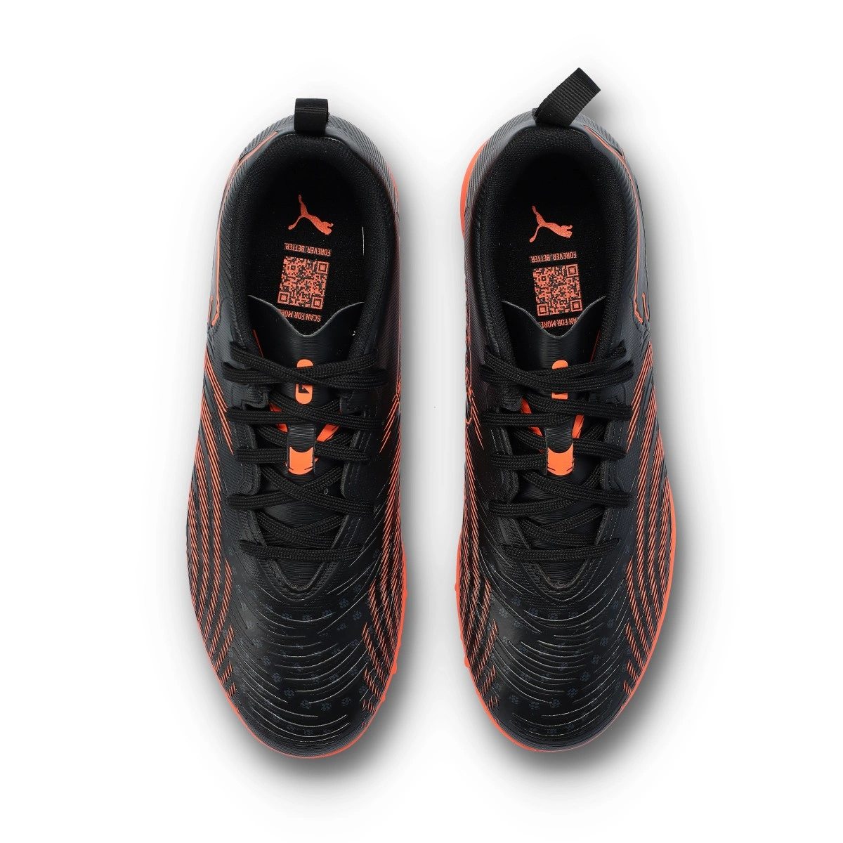 Puma Future 9 Play Football Boots Turf for kids. Synthetic microfibre boots with laces and adhesive strap, designed for use on turf, artificial grass, concrete or dirt pitches. Entry-level boots in Puma Black-Glowing Red-Strong Gray.
