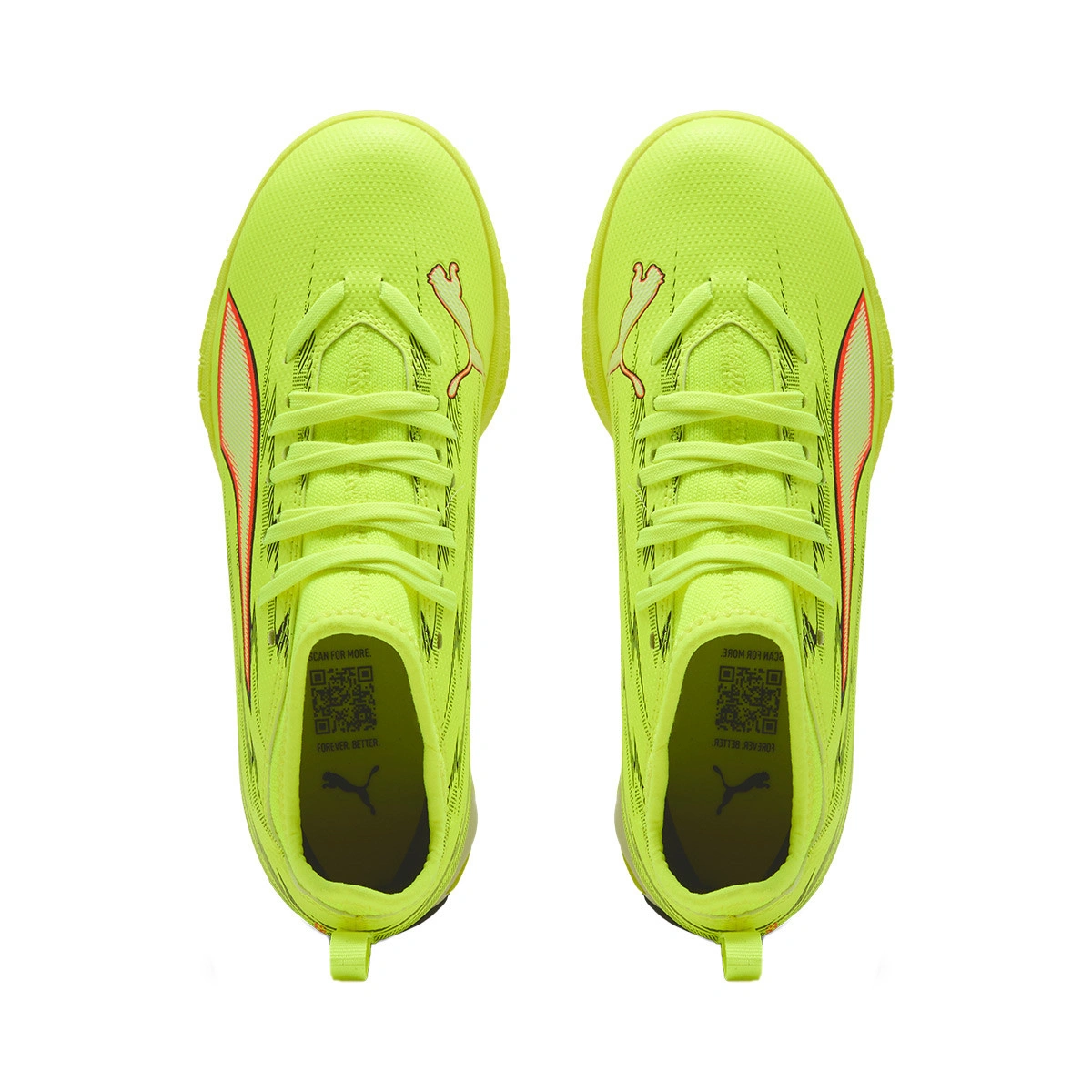 Puma Ultra 6 Match IT + Mid shoes for kids. Synthetic boots for use on concrete and indoor courts. Mid-range boots in Yellow Alert-Puma Black-Puma Silver-Glowing R colour.