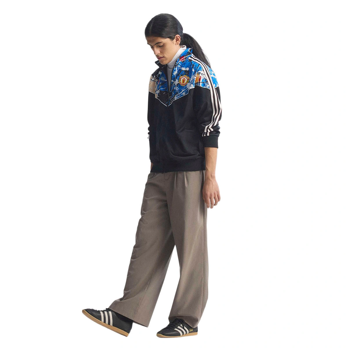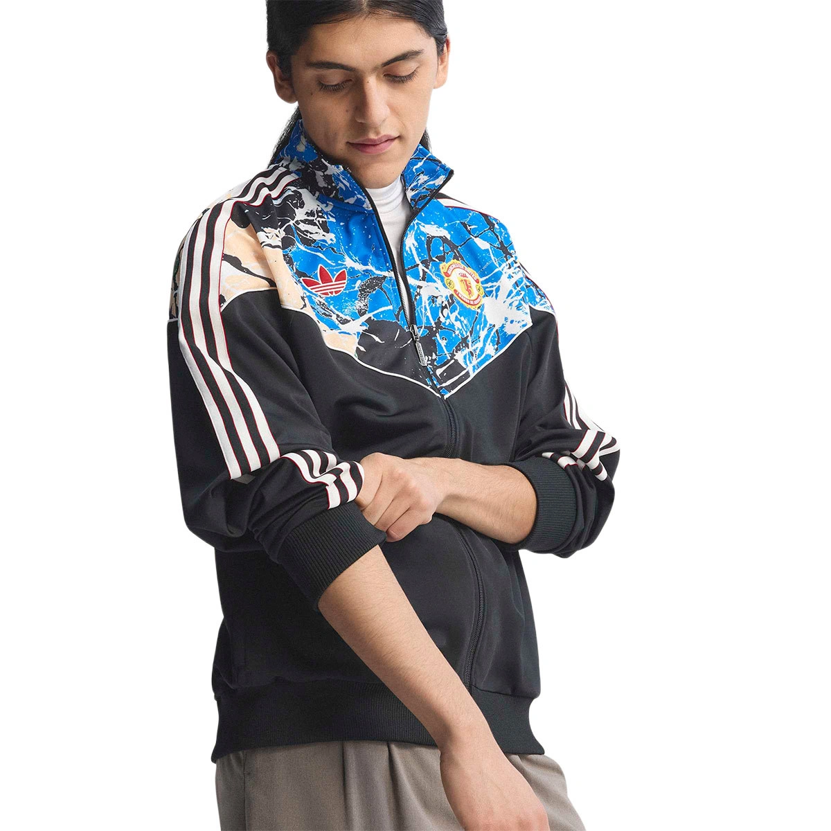 This is not just a sports jacket, it's a tribute to this legendary band and the club's devoted fans. The all-over print references the cover of the single "I wanna be adored" and combines this musical legacy with adidas' unmistakable design. This adidas sports jacket, which brings together art, fashion, music, and sport, captures the creativity and pride that continue to characterise the city of Manchester.