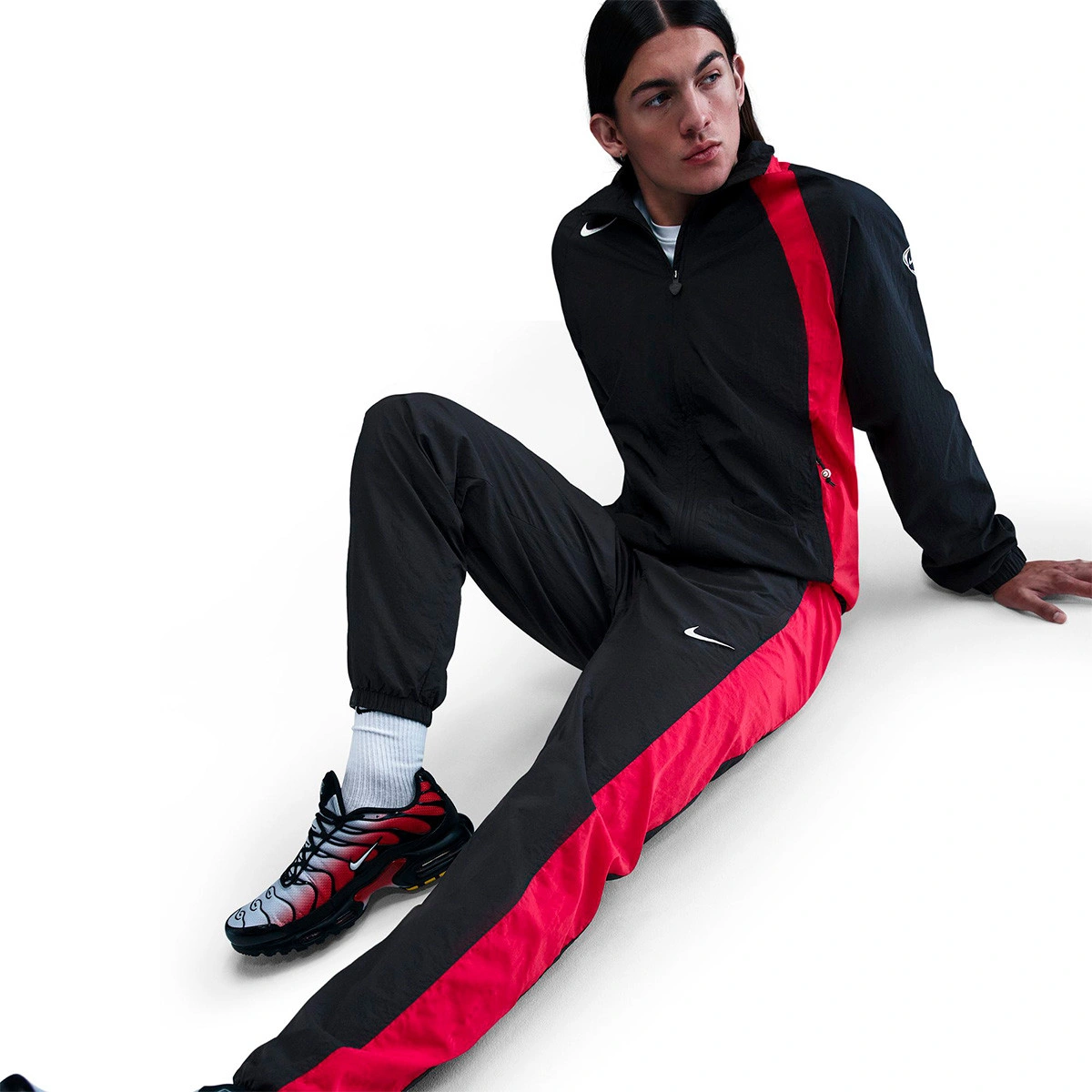 These nylon sports trousers combine the energy of Nike's iconic early 2000s football kits with functional style. Curved, asymmetrical lines with a water-repellent coating and mesh lining create a look that's perfect for playing in the stands or on the street.