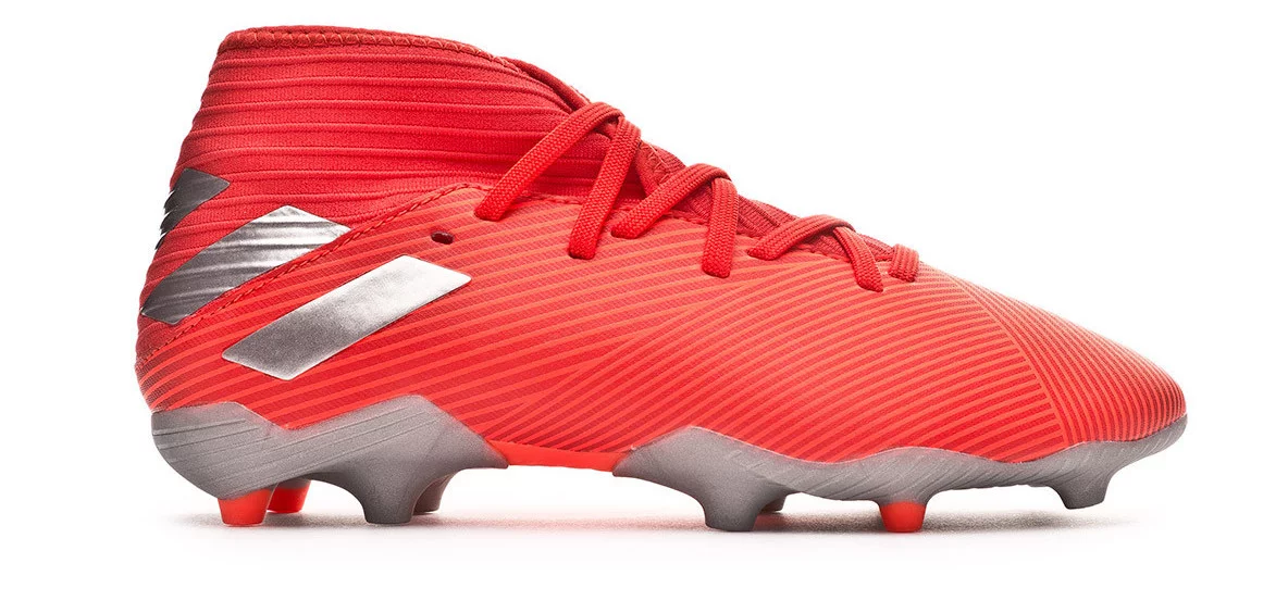 Llegamos a la versión con cordones, pero también gama alta de Nemeziz 19, botas que utilizan muchísimos futbolistas como Leo Messi o Roberto Firmino y que traen un ajuste más “clásico” gracias al cordaje. El material de la carcasa es exactamente el mismo que en la versión plus, solamente que no va tan arriba, ya que no le hace falta, al tener los cordones y libera la zona del tobillo. Esta envoltura en 360º tiene un lockdown mejorado en la versión 19.1 ya que los cordones permiten que el ajuste sea sencillamente perfecto.