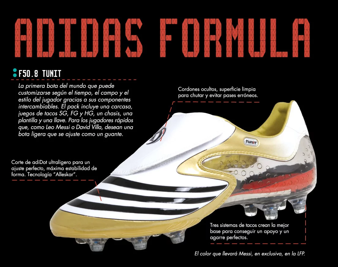 La Copa del Mundo de 2006 se celebraba en Alemania, territorio adidas y la marca de las tres bandas quería dar la campanada... Y la dio, aunque quizás no como ellos se esperaban. Adidas diseñó una bota "tuneable" donde podiamos escoger entre distintas carcasas (más ligeras o más pesadas), distintos Chasis (con diferentes niveles de amortiguación) y tres tipos de tacos (SG, FG y AG). La idea fue muy buena, tuvo una adaptación excepcional en el fútbol profesional... Aunque no tanto en el fútbol amateur. Un producto sometido a tantas tensiones y con tantas piezas distintas terminaba por necesitar continuos recambios. Aunque pasará a la historia por algo, fueron las primeras adidas que utilizó de amnera oficial el que iba a ser la gran imagen de la marca adidas durante la siguiente década: Leo Messi.