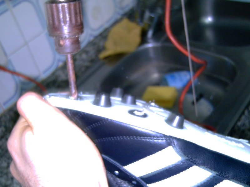 Y llegamos a la parte más delicada de la operación. se trata de con un taladro y una broca del 8 hacerles un agujero justo en el centro de cada taco recortado. hay que tener mucho cuidado de una vez atravesada no seguir empujando con el taladro porque podemos agujerear la piel del empeine. Yo lo que hago para evitar eso es ponerles una cuña de madera dentro de la bota. O las hormas que les ponemos para que no pierdan forma también vale. Se trata de que la broca una vez atravesada la suela pare y no toque la piel de la bota: