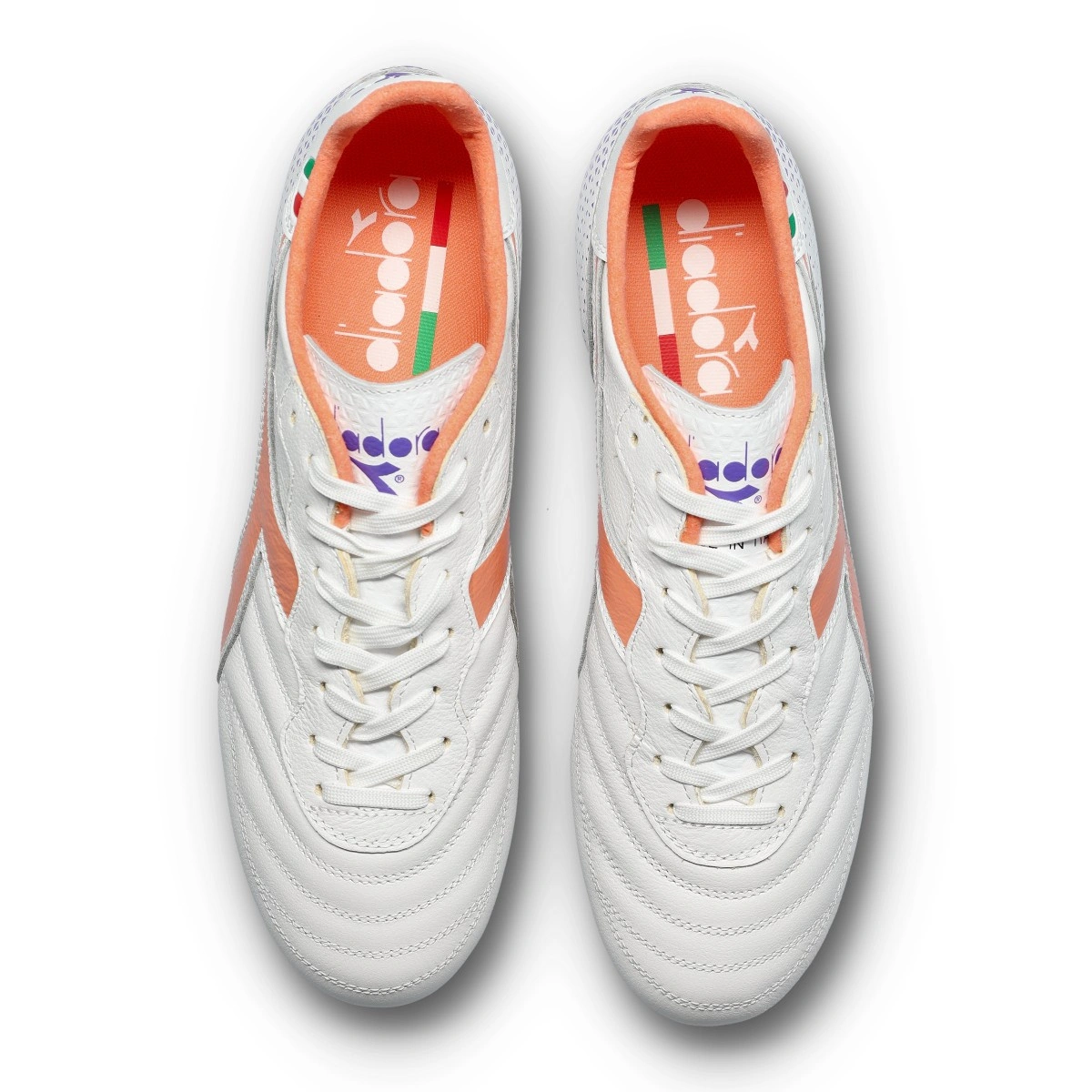 Las Diadora Brasil Italy OG LT + MDPU en color blanco y naranja son el epítome del legado y la artesanía italiana, diseñadas para aquellos jugadores adultos que buscan no solo rendimiento, sino también un toque de clase en cada partido.