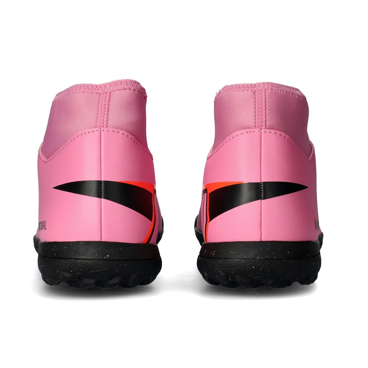 Zapatilla de fútbol Nike Mercurial Superfly 10 Club Turf. Zapatilla de corte sintético con calcetín para utilizar en en campos de moqueta, césped artificial o cemento. Zapatilla de gama base en color Magic Flamingo-Black-Total Crimson.