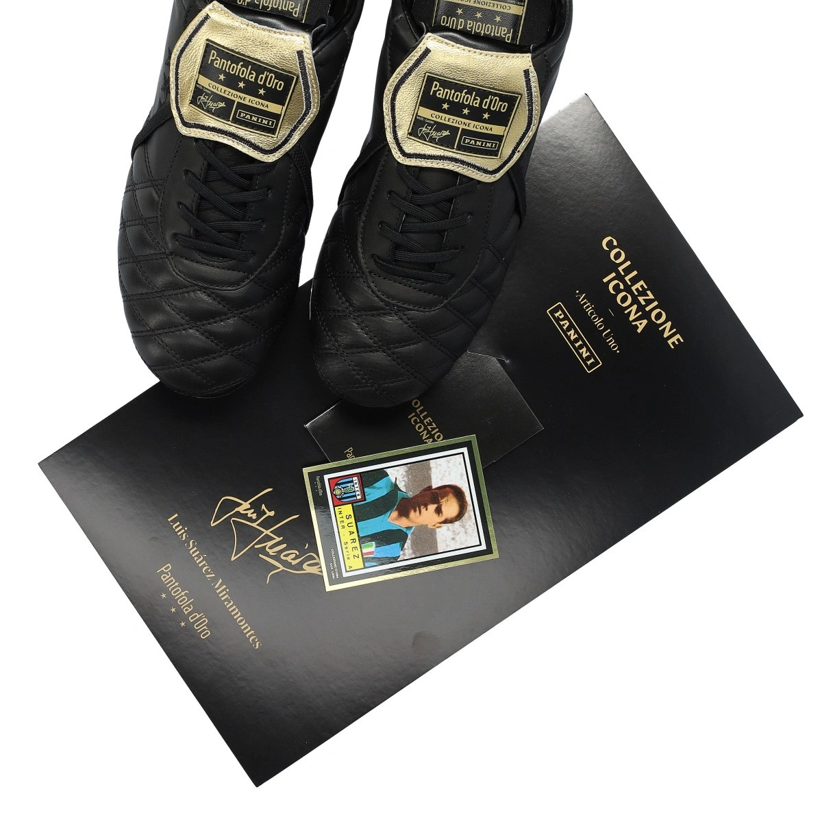 Rinde homenaje a un ícono con las botas de fútbol Pantofola d'Oro Emidio Icona SL x Luisito FG. Una edición especial de las Emidio SL que rinde homenaje a uno de los mejores centrocampistas de la historia, "El Arquitecto", Luis Suárez Miramontes. Forma parte de la "Collezione Icona" de PdO y Panini, y se presenta en una caja especial con una reedición de la tarjeta Panini original de Suárez.