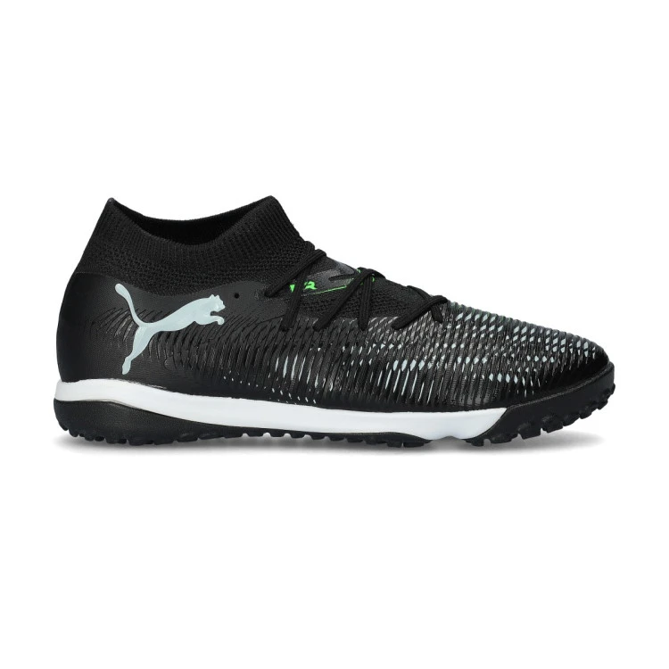 Bota de fútbol Puma Ultra 8  5Match Turf para adultos. Botas sintéticas para utilizar en campos de hierba artificial o moqueta. Botas de gama baja en color Black-Silver-Fluo Green.
