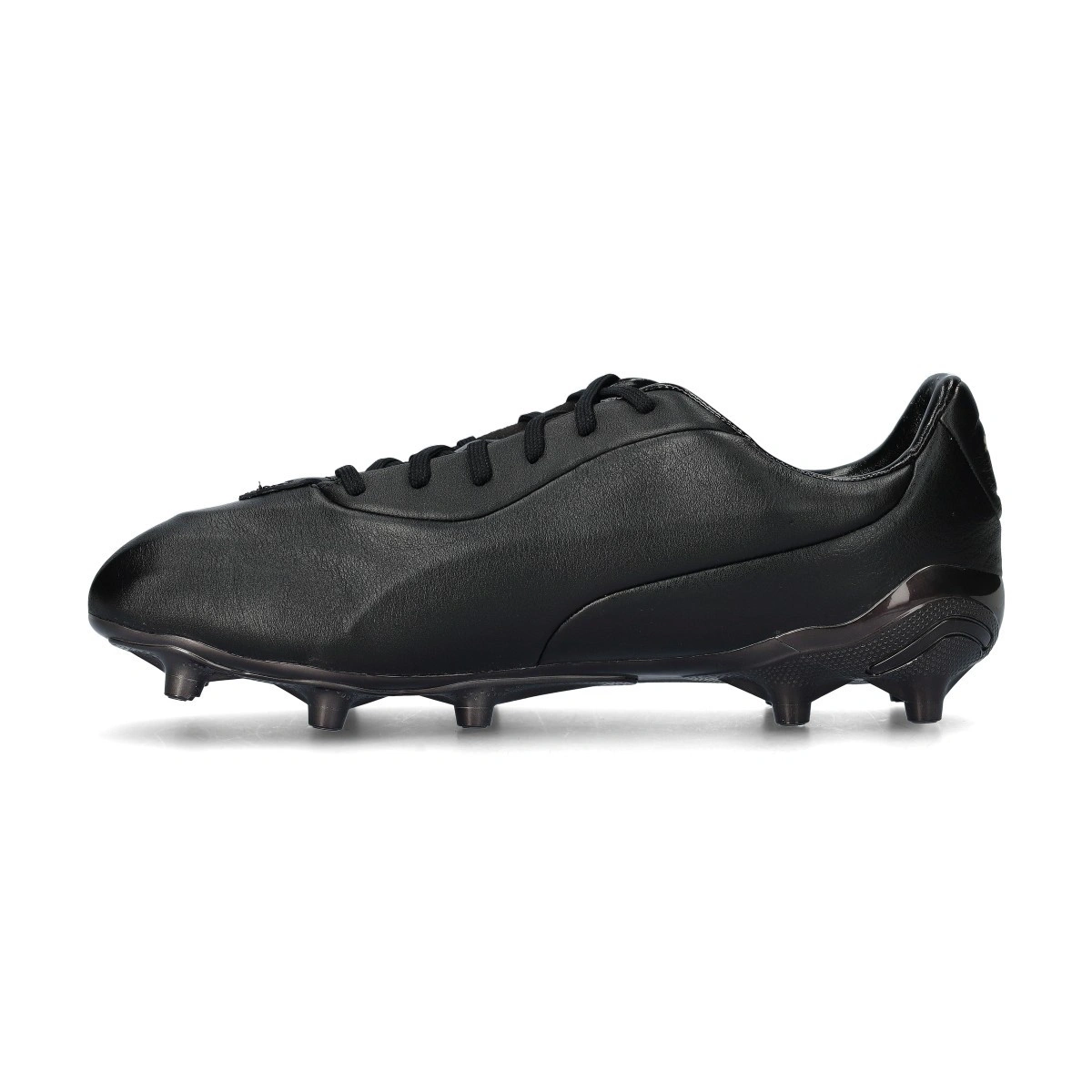 Bota de fútbol Puma King Platinum FG/AG. Bota de gama alta con cordones para campos de césped natural y artificial en color Black-Black-Metallic Gold.