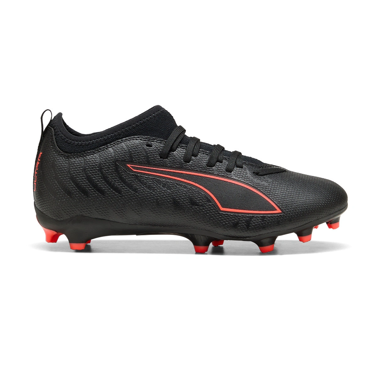 Bota de fútbol Puma Ultra 6 Match FG/AG para niño. Botas sintéticas para utilizar en campos de hierba natural artificial. Botas de gama base en color Puma Black-Puma Red-Strong Gray.