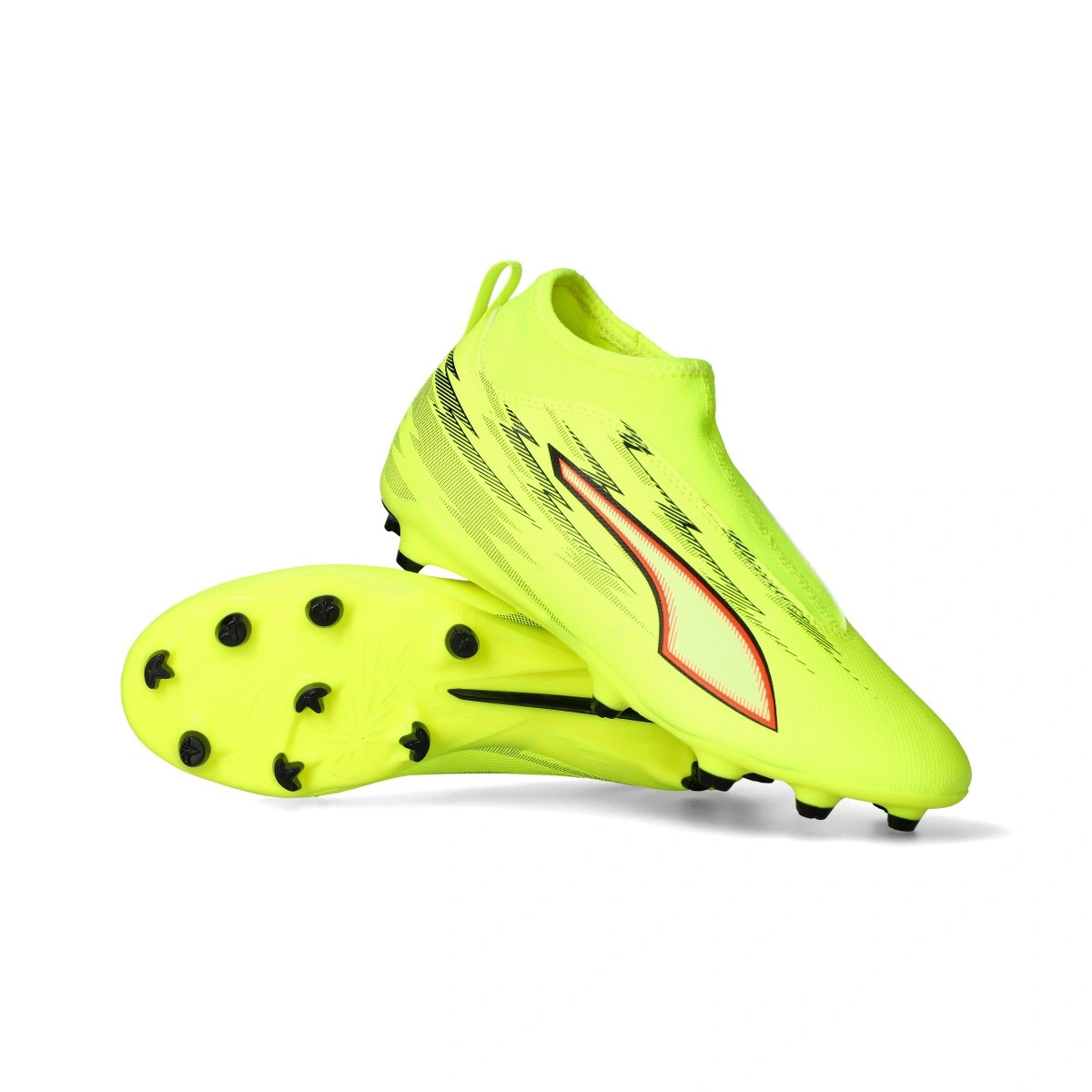 Bota de fútbol Puma Ultra 6 Match+ LL FG/AG Mid Niño. Botas sintéticas para utilizar en campos de hierba natural artificial. Botas de gama base en color Yellow Alert-Puma Black-Puma Silver-Glowing R.