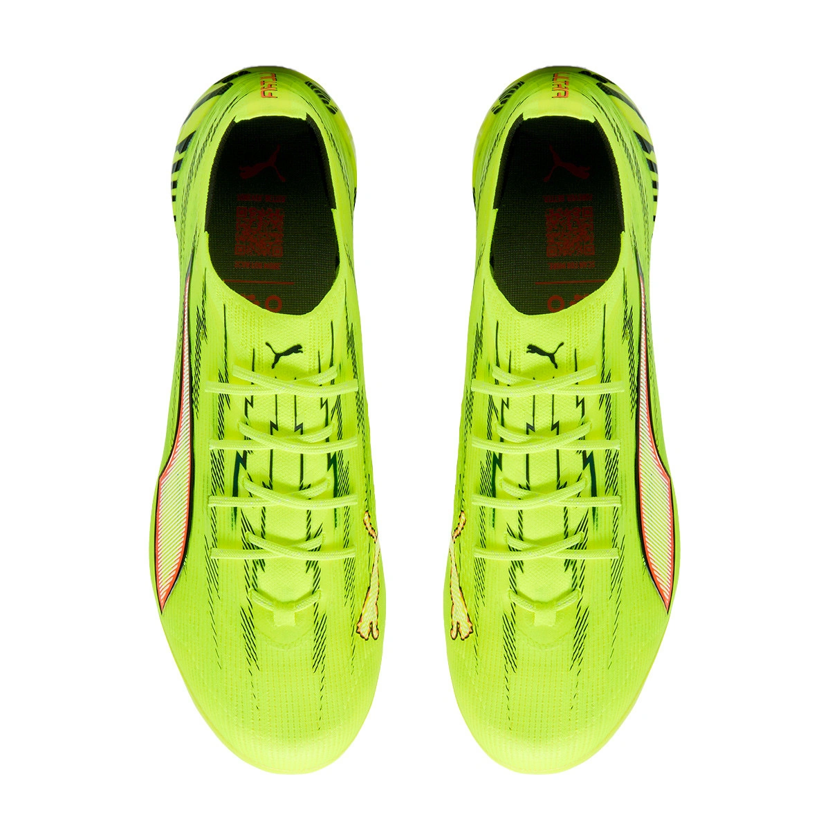 Bota de fútbol Puma Ultra 6 Ultimate AG. Botas de microfibra para utilizar en campos de césped artificil. Botas de gama alta en color Yellow Alert-Black-Silver-Glowing.