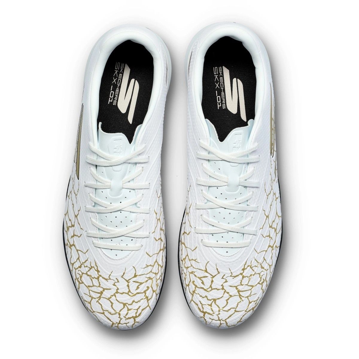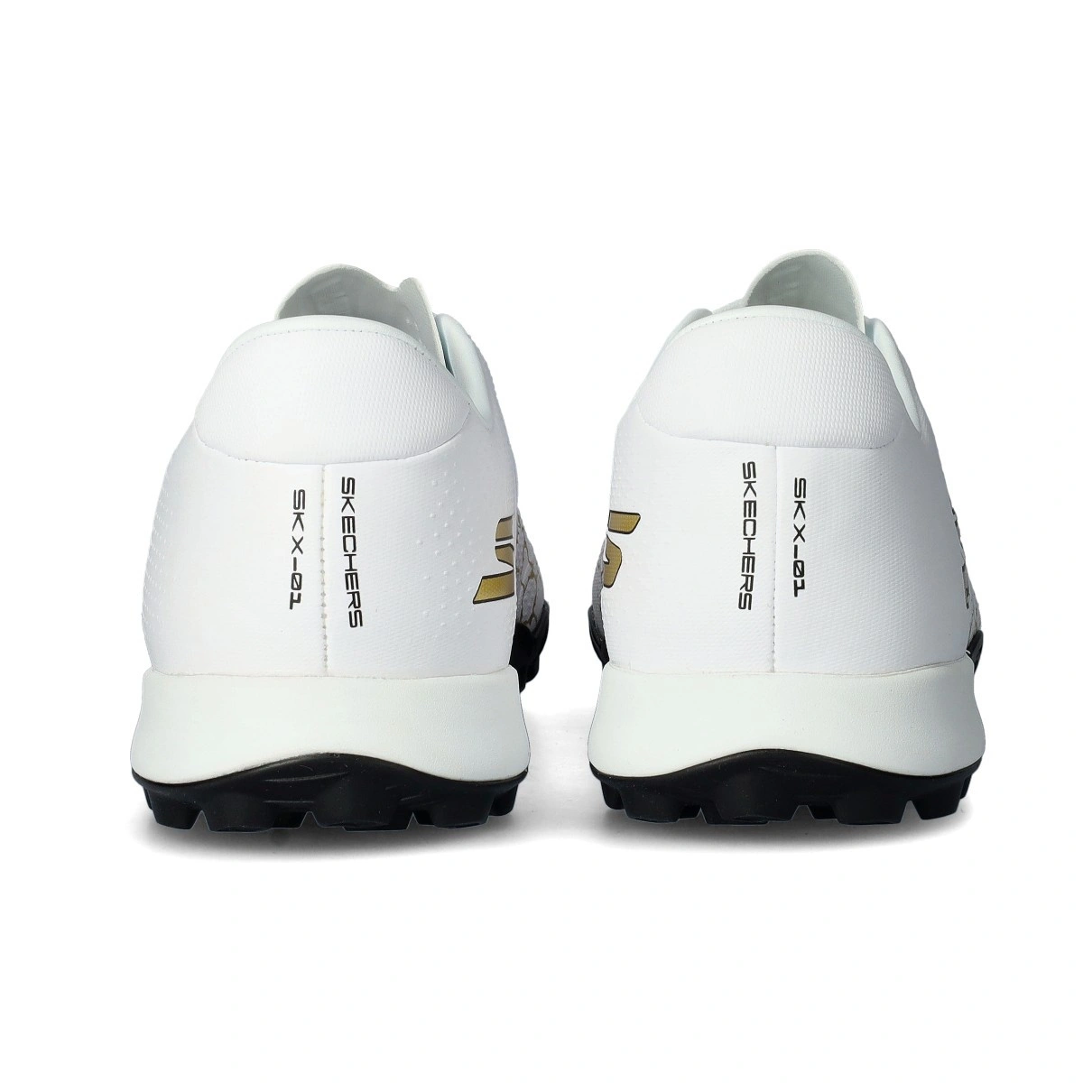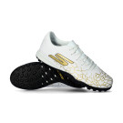 Bota Soccer Skx_1.5 Academy Turf de la marca Skechers en color White-Gold para moqueta o campos de césped artificial.