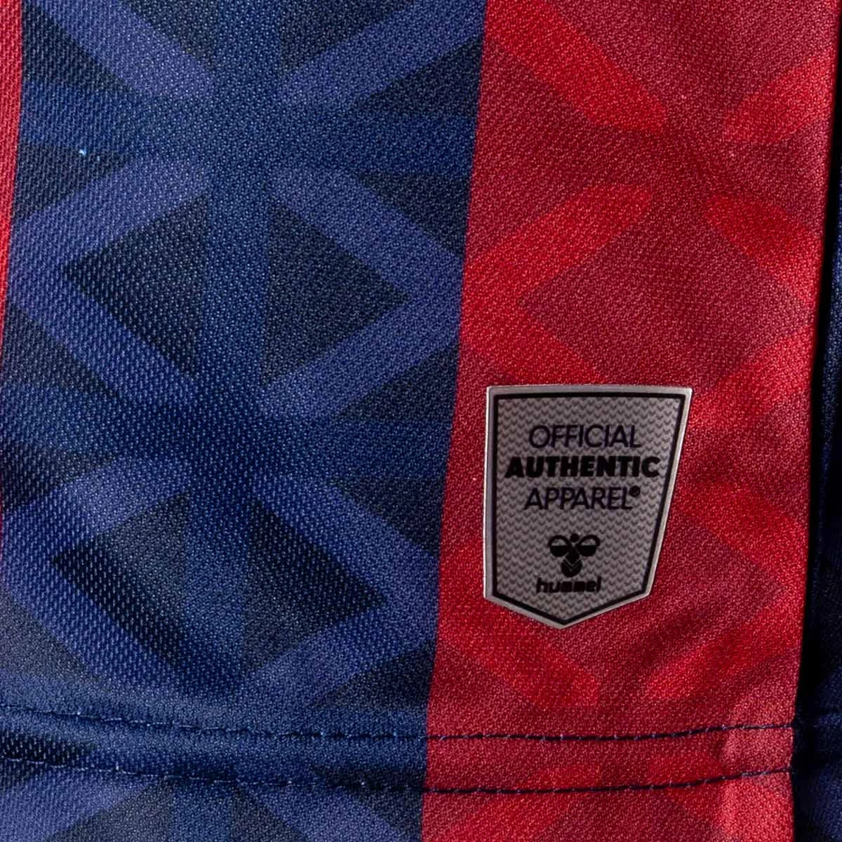 Camiseta primera equipación de la SD Eibar para la tmeporada 2023-2024. Hazte con la camiseta del equipo armero en su vuelta a la primera división. Confeccionada con el clásico diseño a rayas azul y granate con algunos toques personalizados. Entre ellos destaca un sutil estampado inspirado en la X del escudo del club.