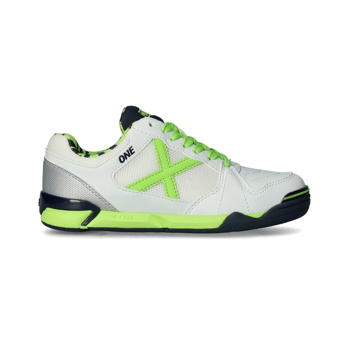 La One Indoor es la zapatilla de fútbol sala fabricada con base de rejilla y refuerzos de material sintético. Incorpora refuerzo de TPU en la puntera para una mayor solidez, contundencia y firmeza en el golpeo.