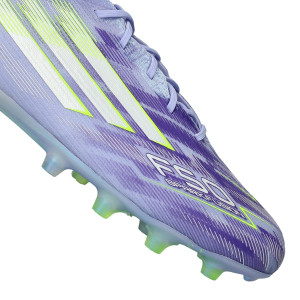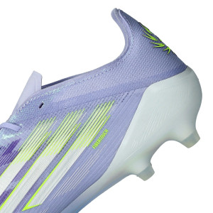 Chaussures de football adidas F50 Elite L FG/AG pour femmes. Chaussures à lacets à utiliser sur les terrains en gazon naturel et artificiel. Chaussures haut de gamme de couleur Violet Tone-Lucid Lemon-Purple Rush.