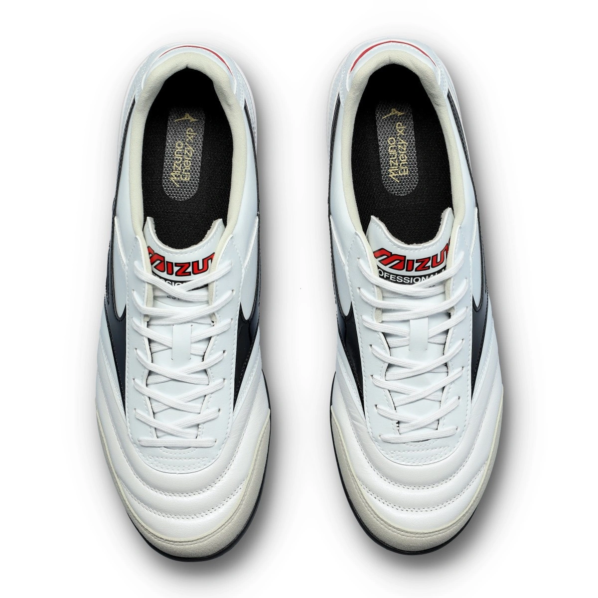 Chaussures de football Mizuno Morelia Sala Elite Turf en blanc-noir-rouge chinois pour terrains en gazon artificiel. Ces chaussures sont idéales pour les joueurs qui recherchent un excellent ajustement et un bon amorti.