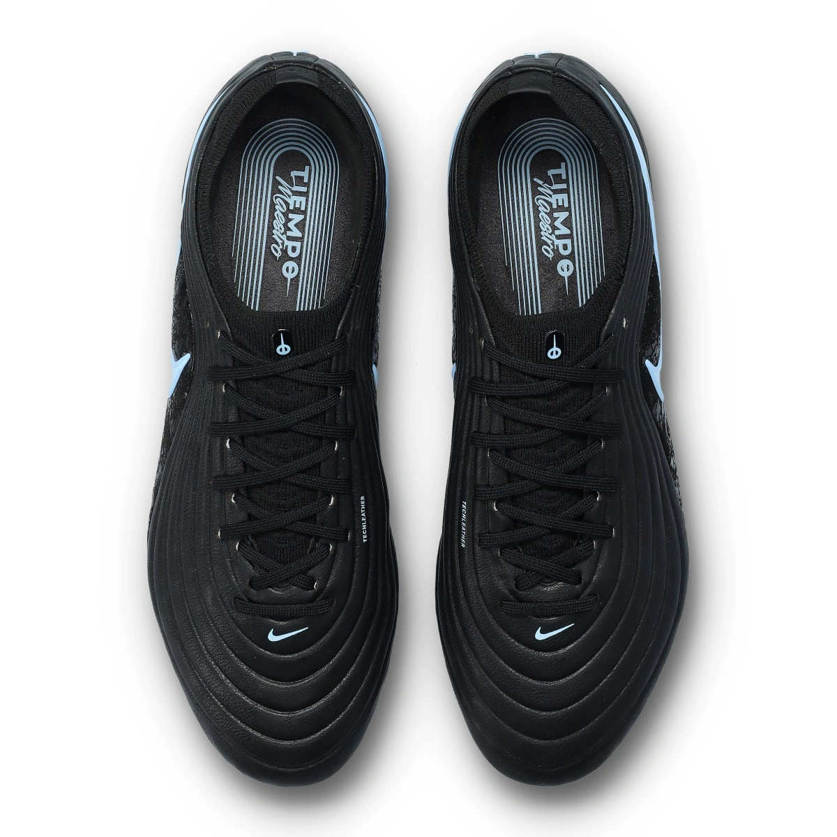 Chaussure de football Nike Tiempo Maestro Elite AG-Pro pour adultes. Chaussure avec cuir Flytouch plus pour terrains en gazon artificiel.  Chaussures haut de gamme en coloris Black-Ice Blue.