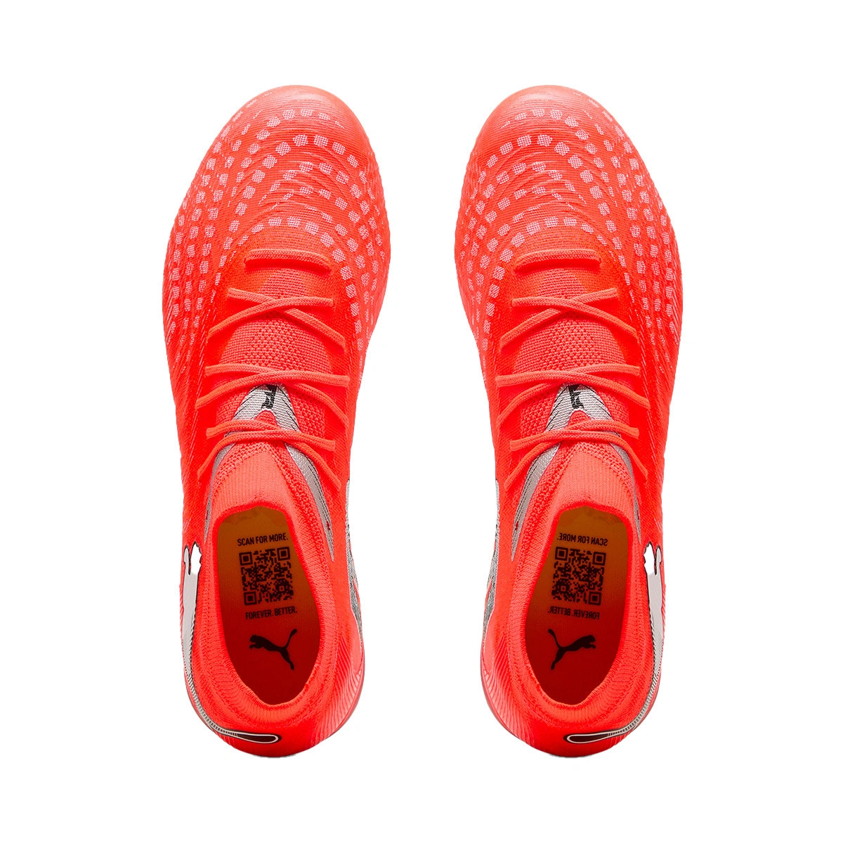 Chaussure de football Puma Future 9 Match MxSG pour adultes. Chaussures synthétiques à utiliser sur terrains en herbe naturelle humide. Chaussures d'entrée de gamme en couleur Puma Red-Puma White-Glowing Red-Puma Black.
