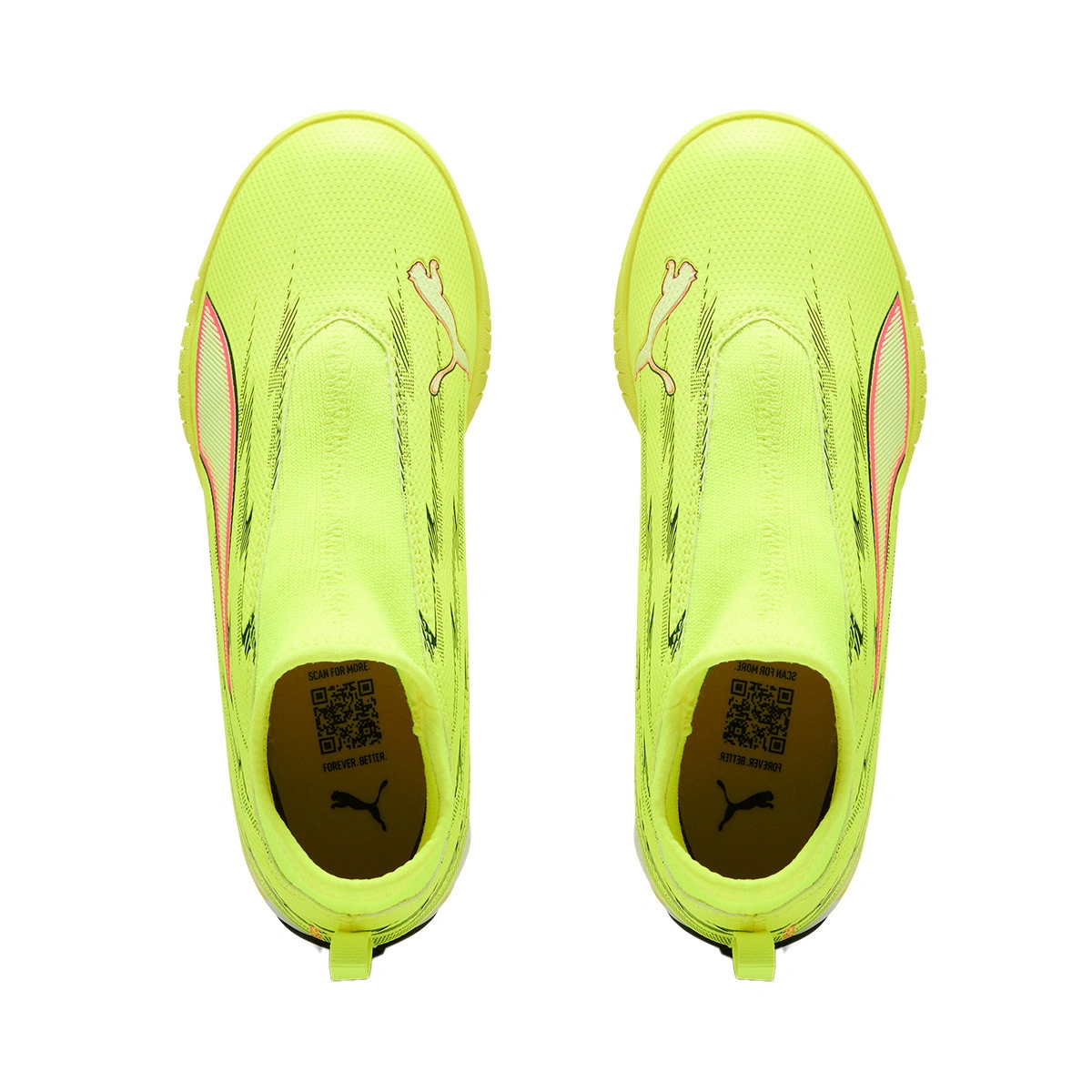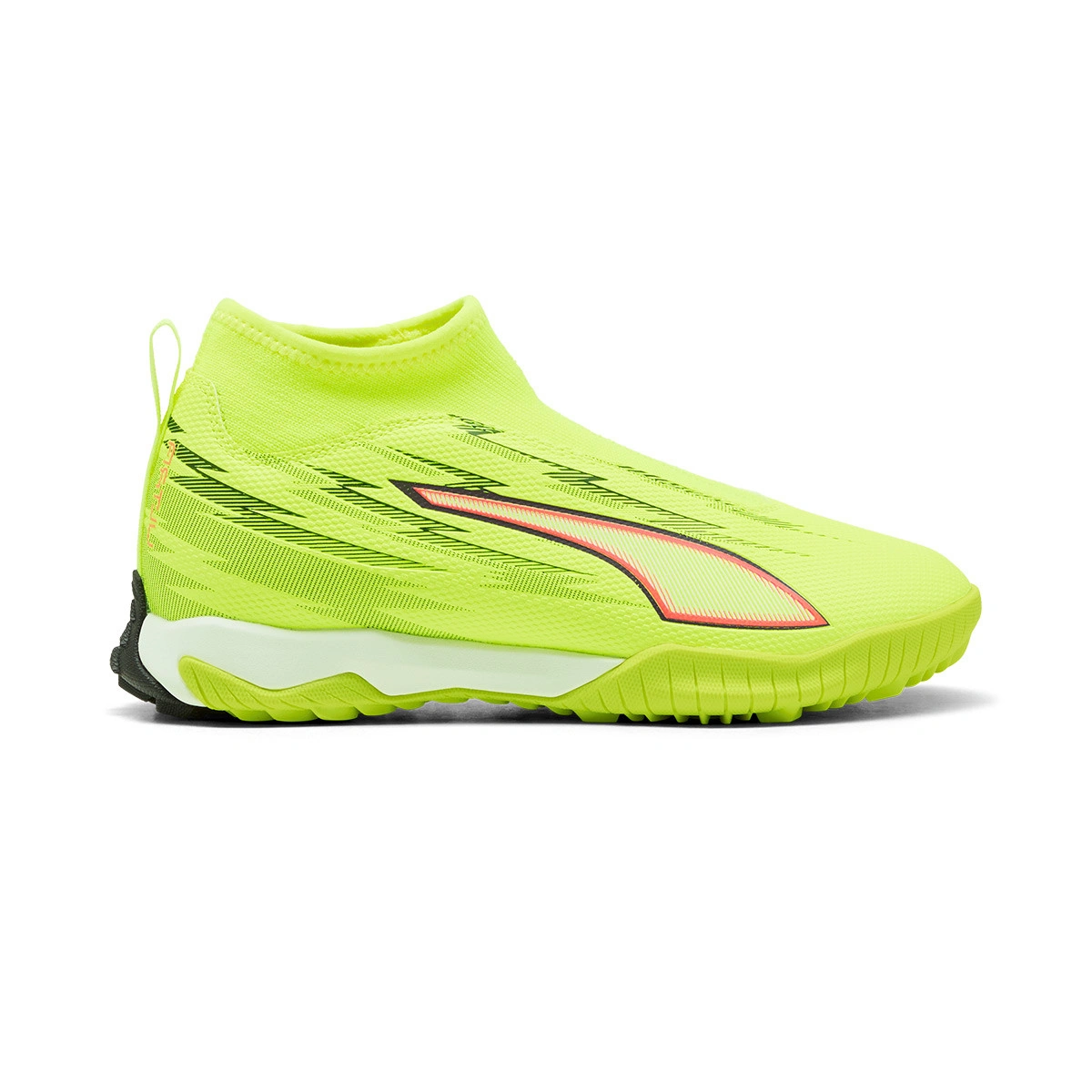 Chaussure de football Puma Ultra 6 Match+ LL Turf Mid Enfant. Chaussures synthétiques à utiliser sur terrains en gazon artificiel ou moquette. Chaussures d'entrée de gamme en couleur Yellow Alert-Puma Black-Puma Silver-Glowing R.