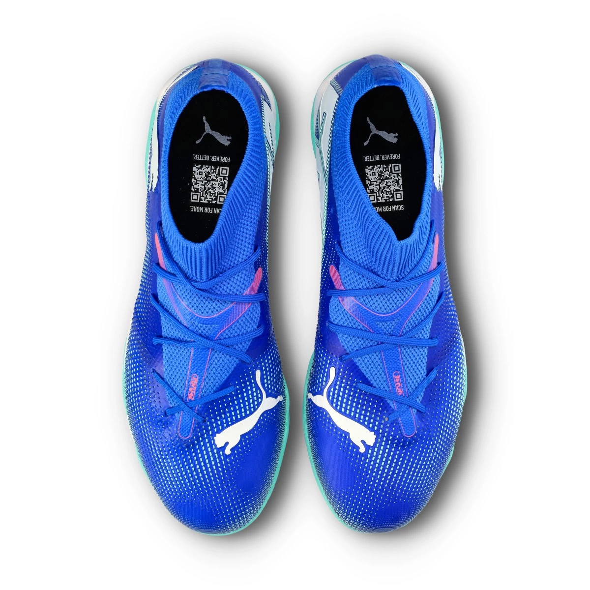 Chaussures de futsal PumaFuture 7 Match IT Mid. Chaussures synthétiques pour l'intérieur. Chaussures de milieu de gamme en coloris Bluemazing-White-Electric Peppermint.