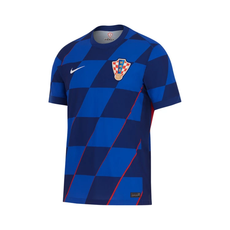 Le Maillot Extérieur de la Croatie pour l'Euro 2024 présente un design traditionnel avec son motif à carreaux typique dans les tons bleus.