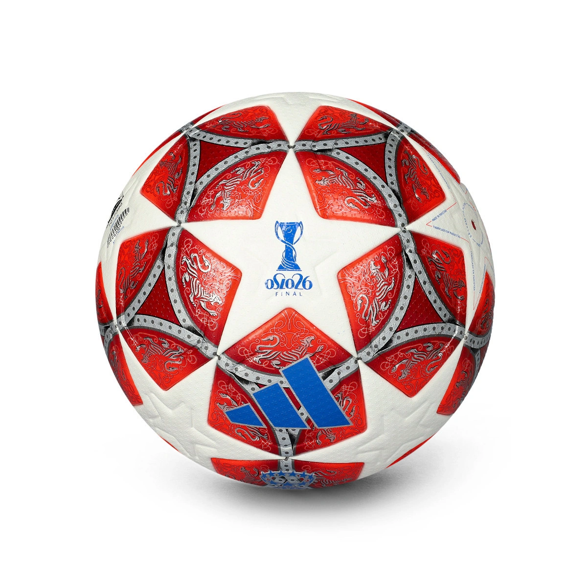 Play with confidence like the top stars. Adidas launches the ball for the final of the UEFA Women Champions League 2026, featuring red, blue and white as the main colours, with graphics representing the host city. Experience the final of the competition to be played at the Ullevaal Stadion in Oslo to the fullest!