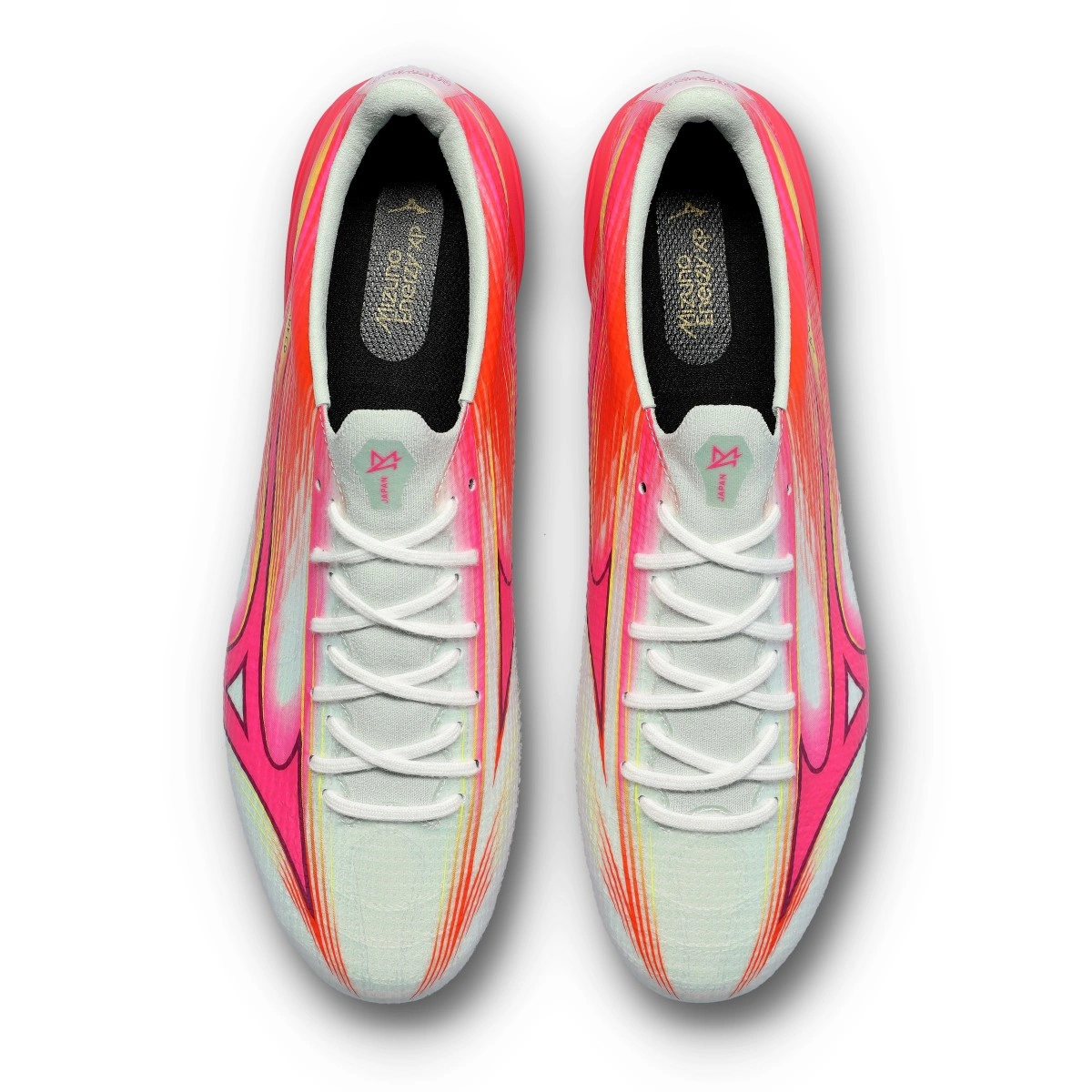 Mizuno Alpha Football Boots III Japan FG. Synthetic football boots with laces for use on natural grass pitches. Top-tier boots in White-Fuchsia Purple.
