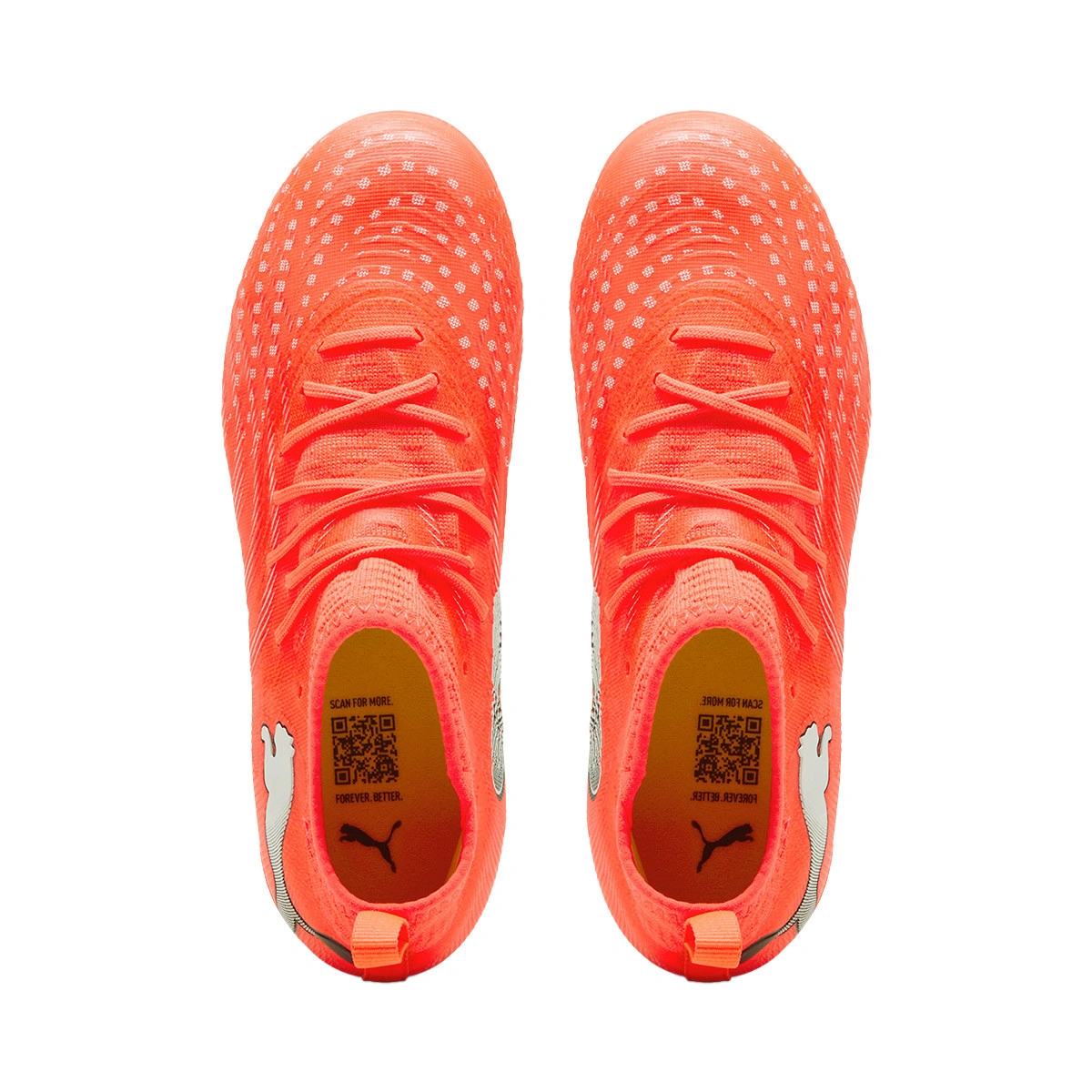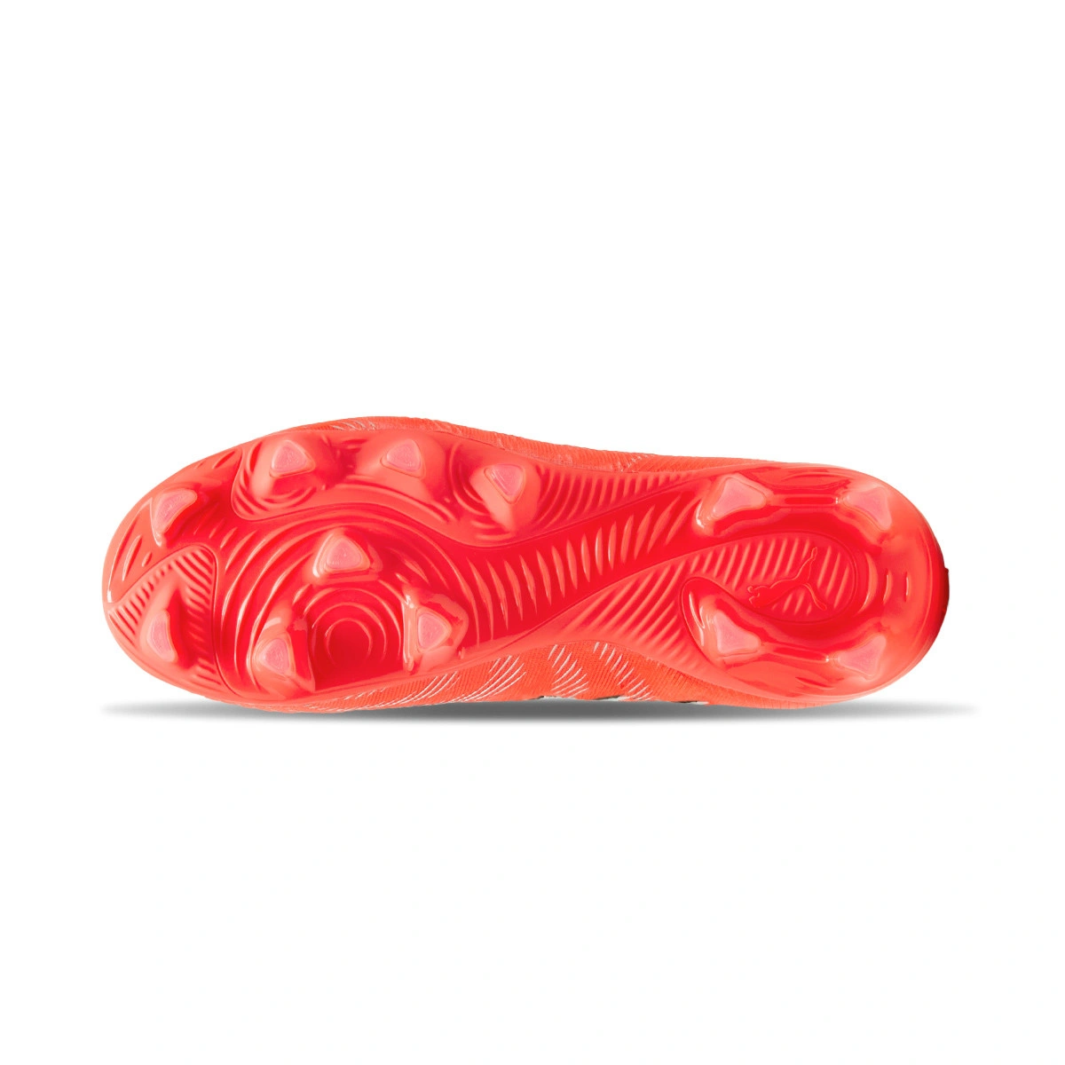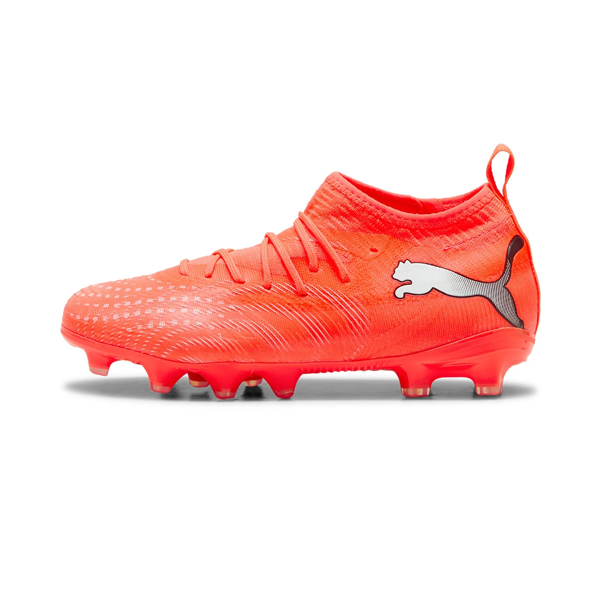 Puma Future 9 Match FG/AG football boot for kids. Synthetic boots for use on artificial grass pitches. Entry-level boots in Puma Red-Puma White-Glowing Red-Puma Black.