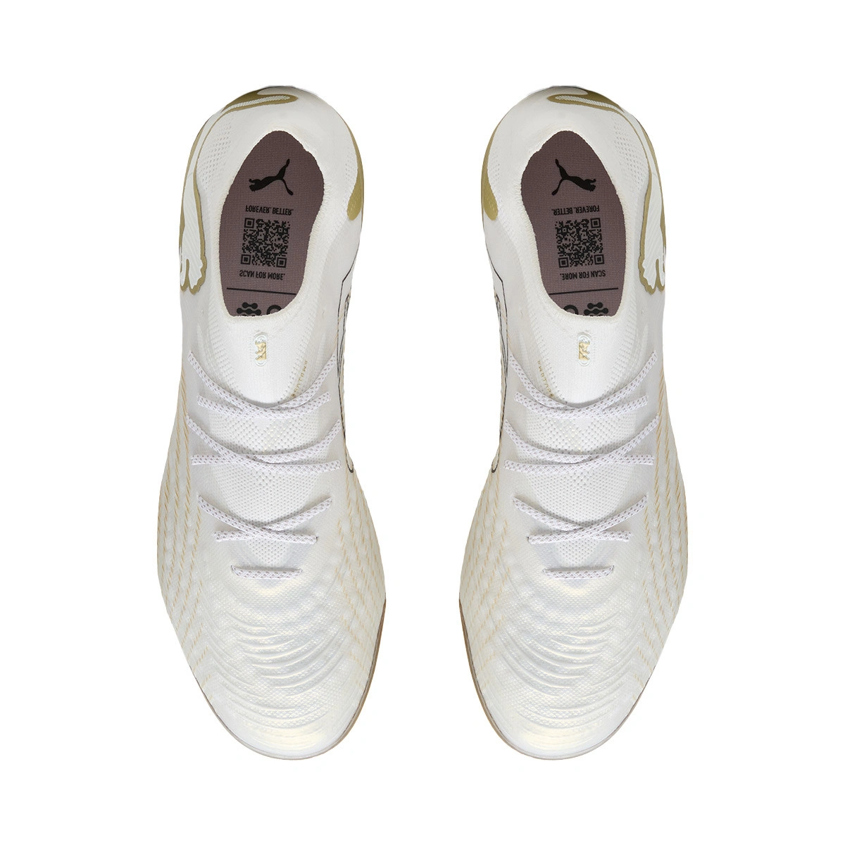 Puma Future Ultimate Football Boots AG. Knitted boots, for use on artificial grass pitches. Top-range boots in White-Metallic Gold-Black.