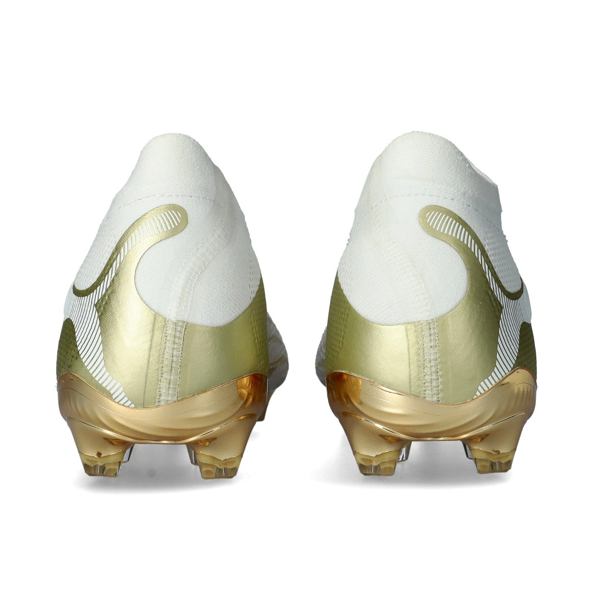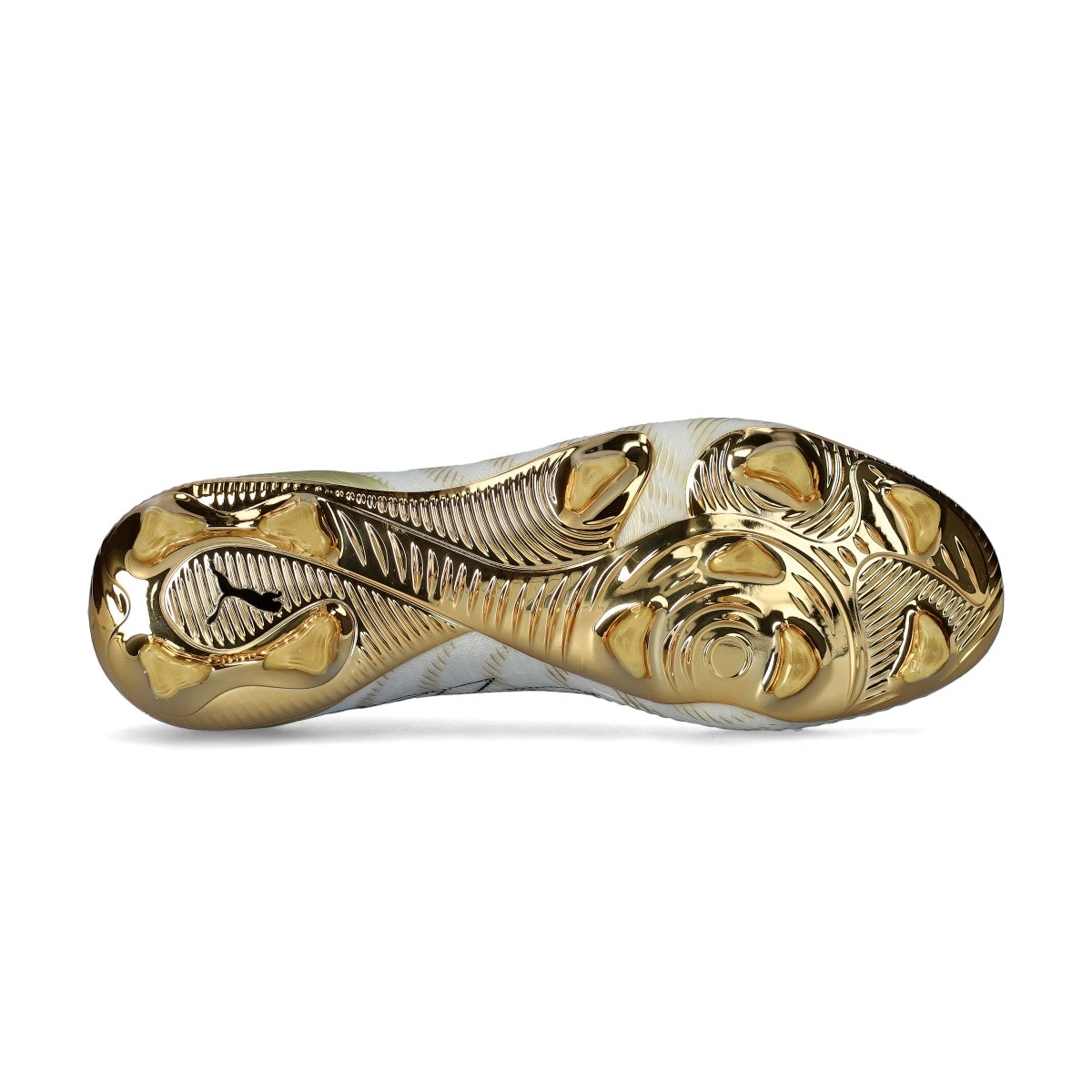 Puma Future Ultimate Football Boots FG. Knitted boots, for use on dry natural grass pitches. Top-range boots in White-Metallic Gold-Black.
