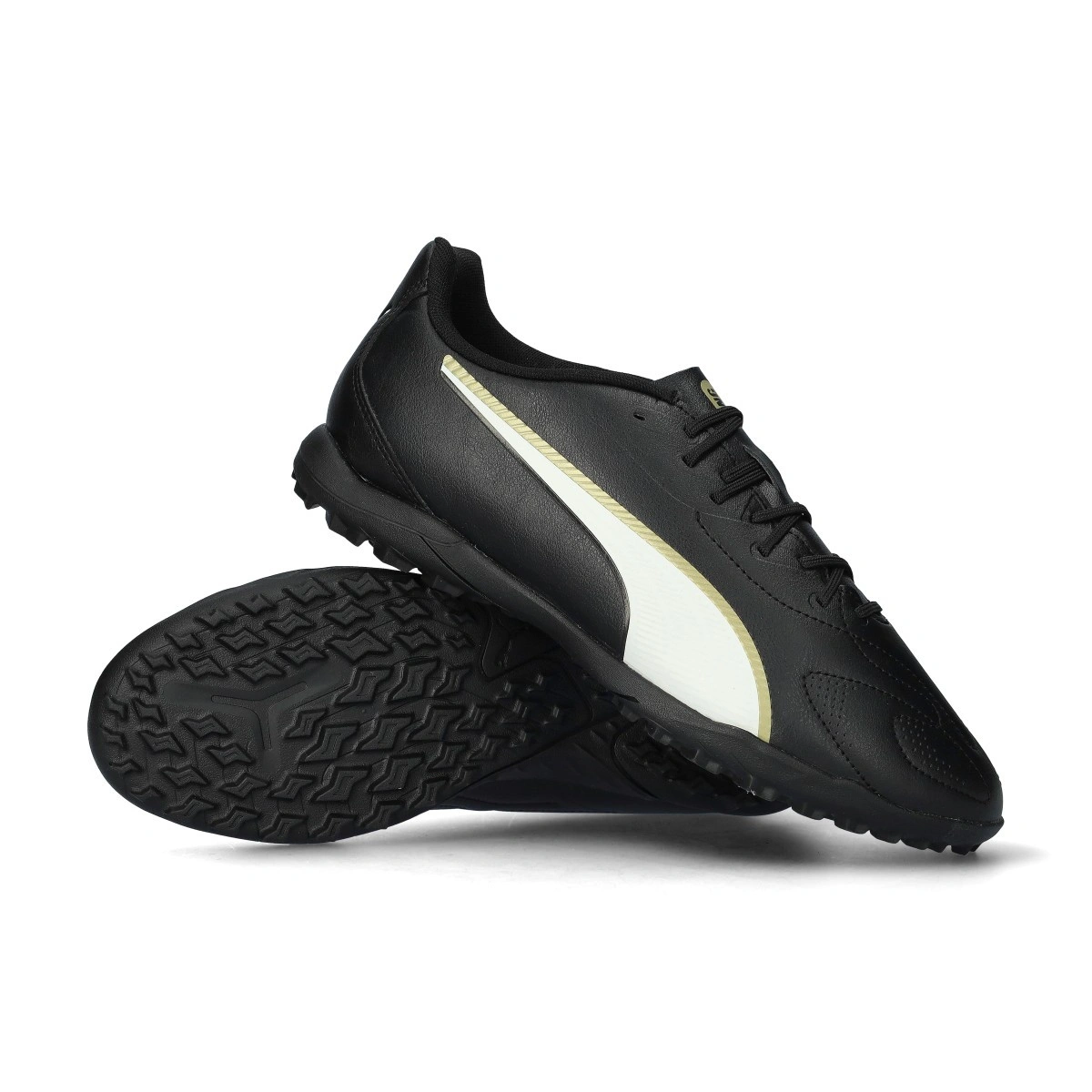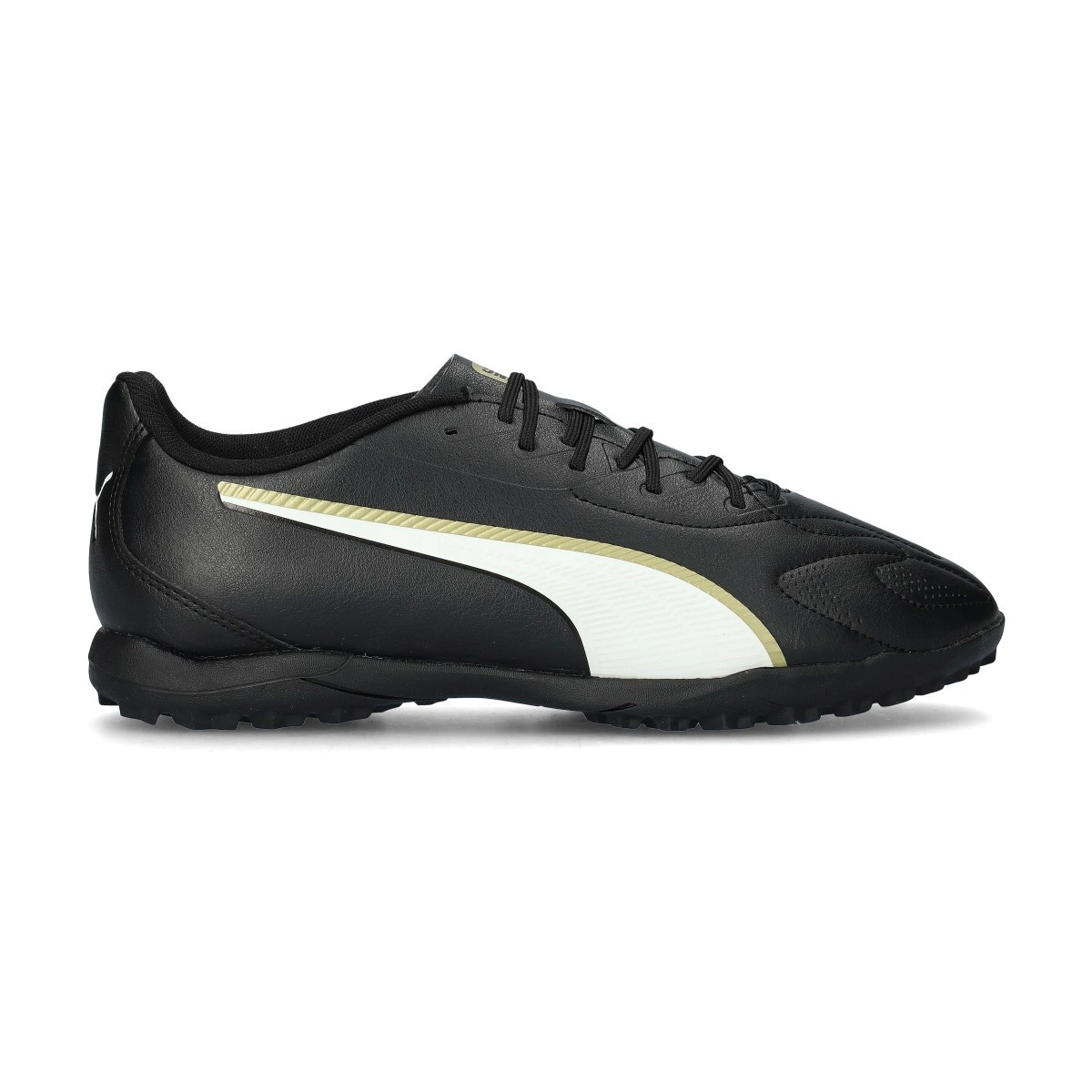 Puma King Play Football Boots 20 Turf. Synthetic boots for use on artificial grass and carpet pitches. Entry-level boots in Puma Black-Puma White-Puma Gold.