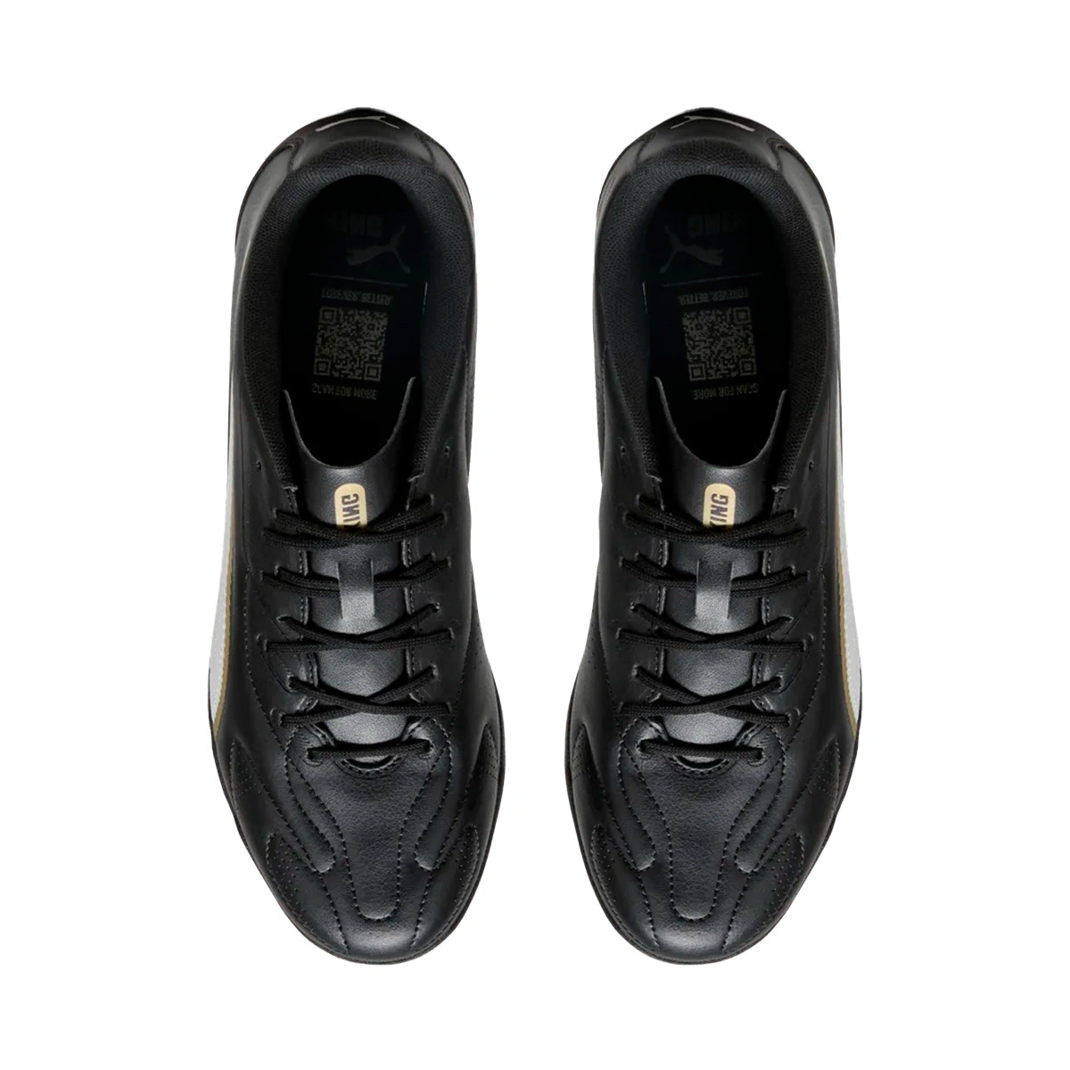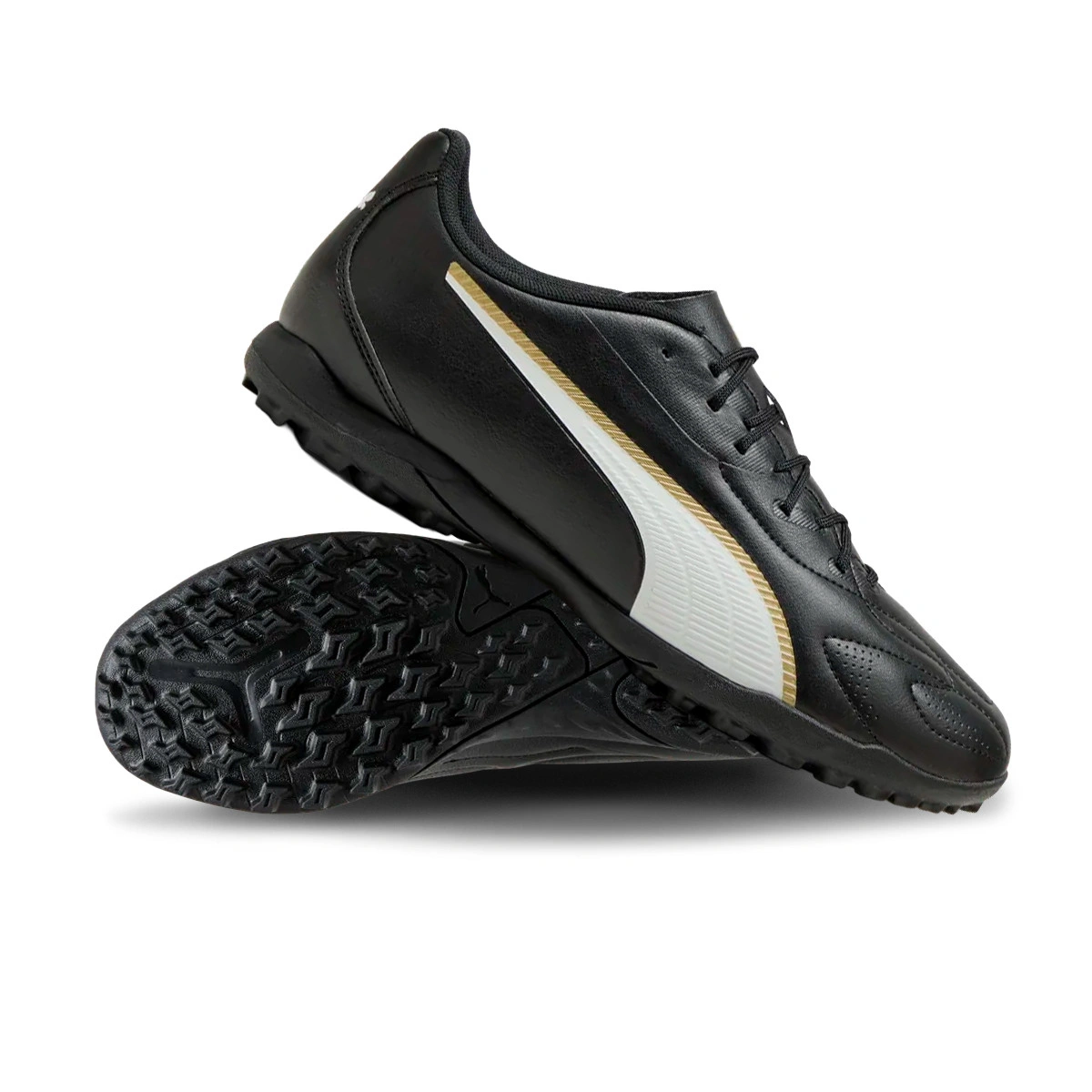 Puma King Play Football Boots 20 Turf. Synthetic boots for use on artificial grass and carpet pitches. Entry-level boots in Puma Black-Puma White-Puma Gold.