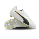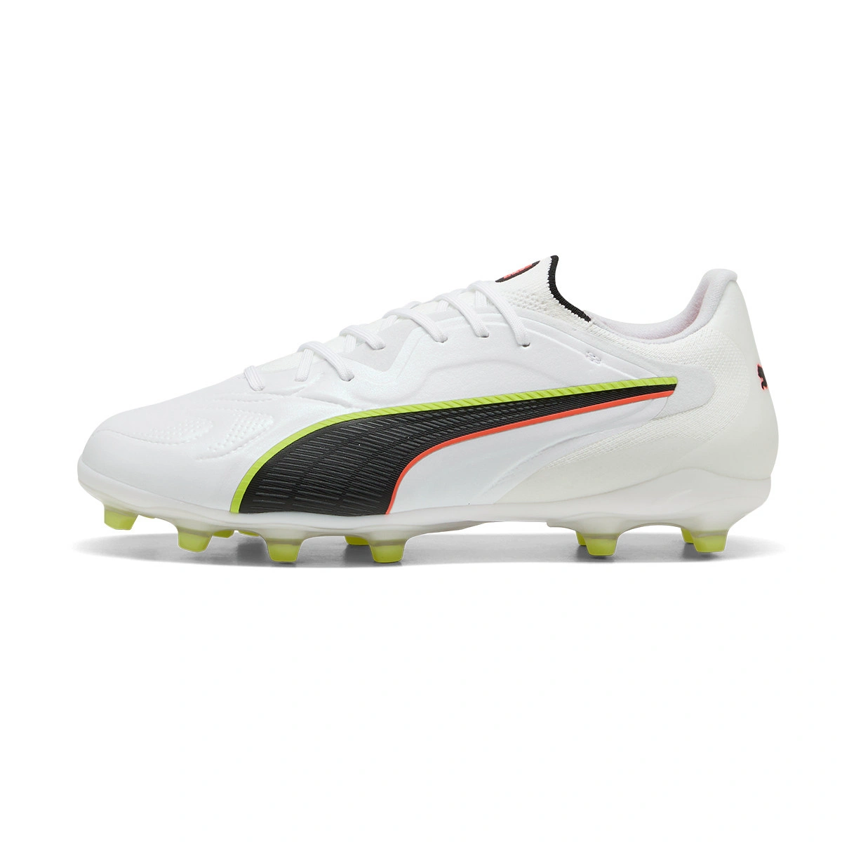Puma King Pro 20 FG/AG adult football boot. Synthetic leather football boots for natural grass pitches and latest generation artificial grass pitches. Mid-range football boots in White-Glowing Red-Yellow Alert.