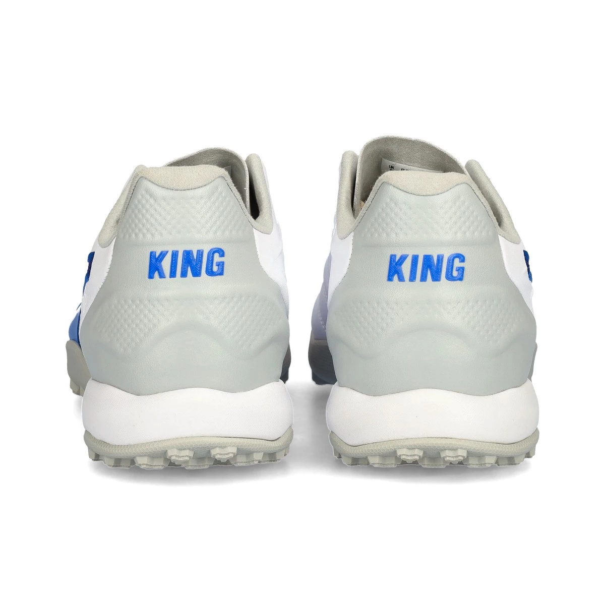 Puma King Pro Turf football boots. Synthetic boots to be used on carpet or artificial grass fields fields. Mid-range boots in White-Bluemazing-Flat Light Gray colourway.