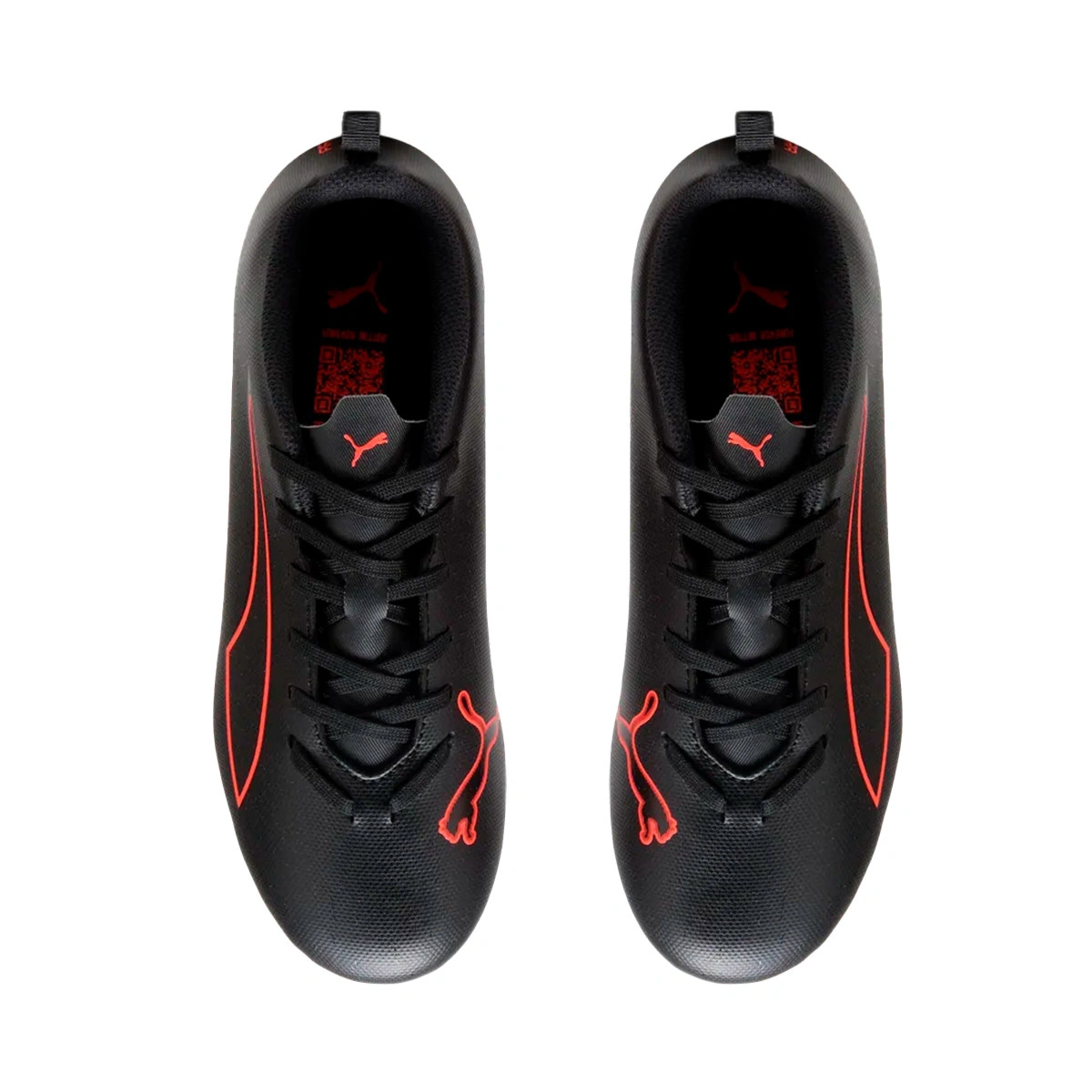 Puma Ultra 6 Play Football Boots FG/AG for kids. Synthetic boots for use on artificial grass and natural grass pitches. Entry-level boots in Puma Black-Puma Red-Strong Gray colour.