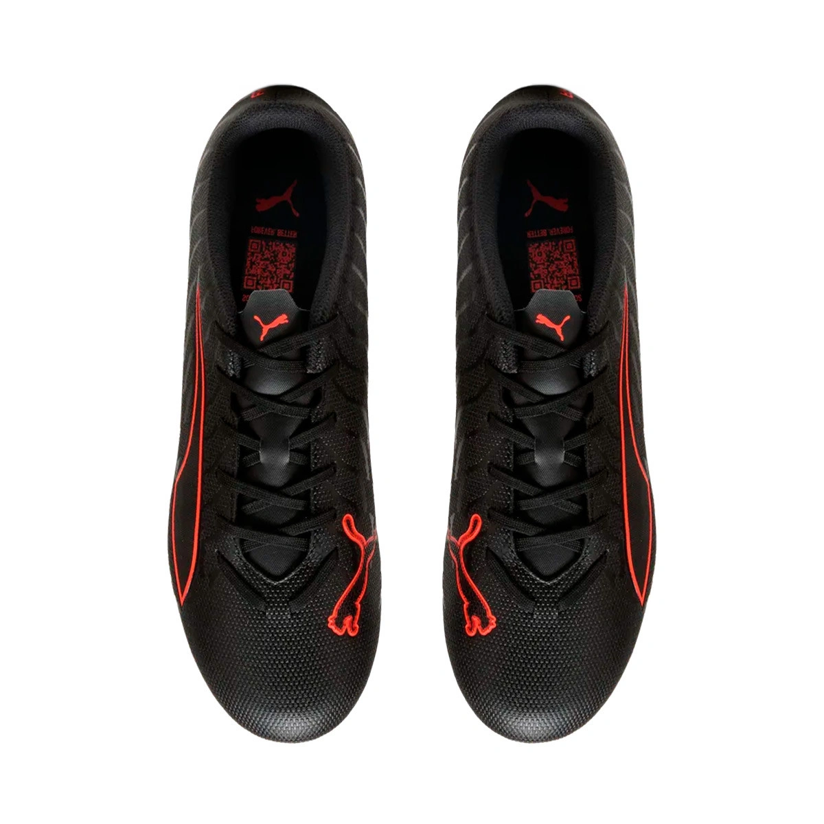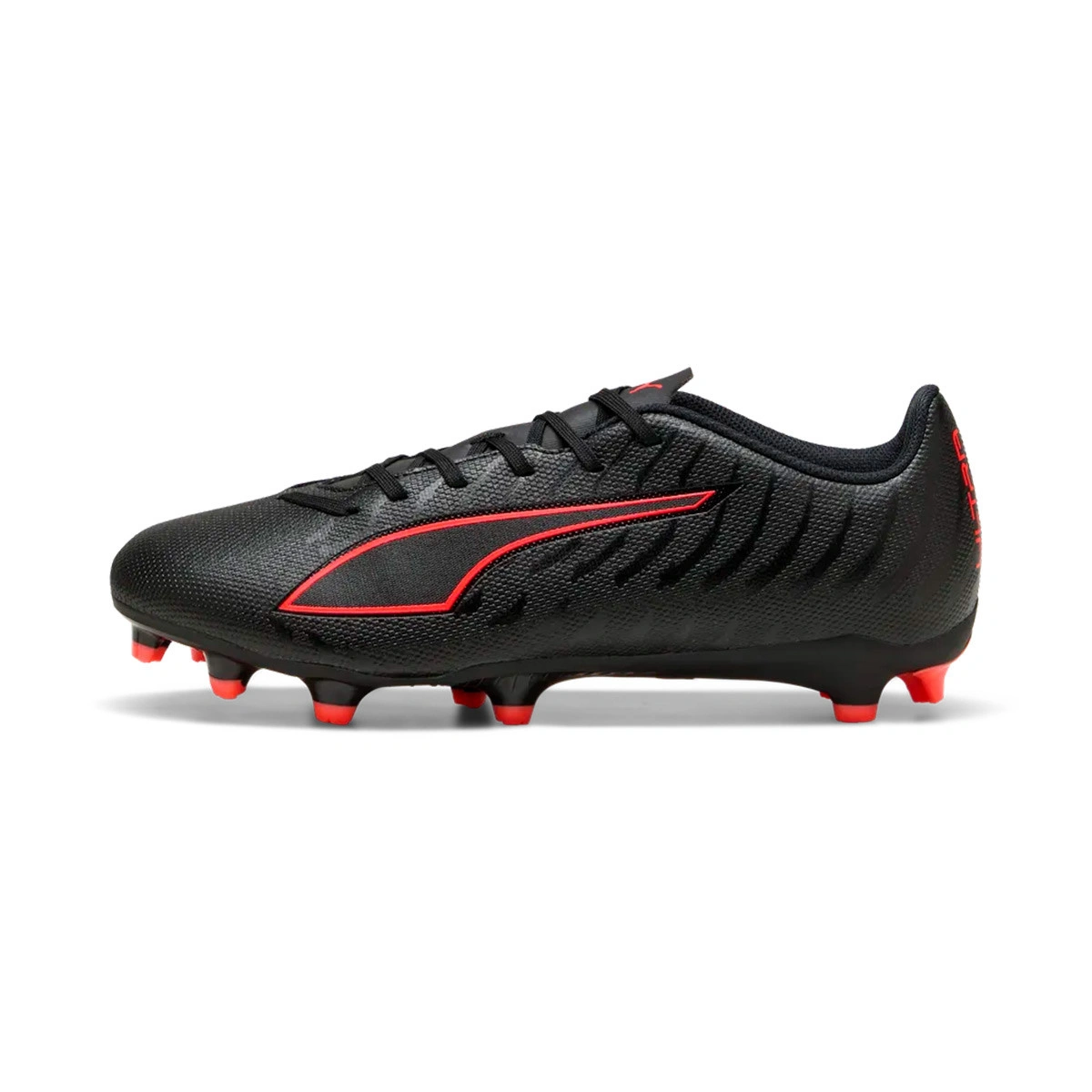 Puma Ultra 6 Play Football Boots FG/AG for adults. Synthetic boots for use on artificial grass and natural grass pitches. Entry-level boots in Puma Black-Puma Red-Strong Gray.