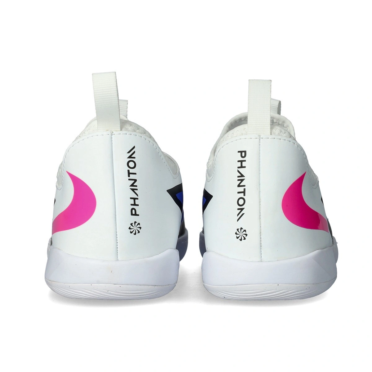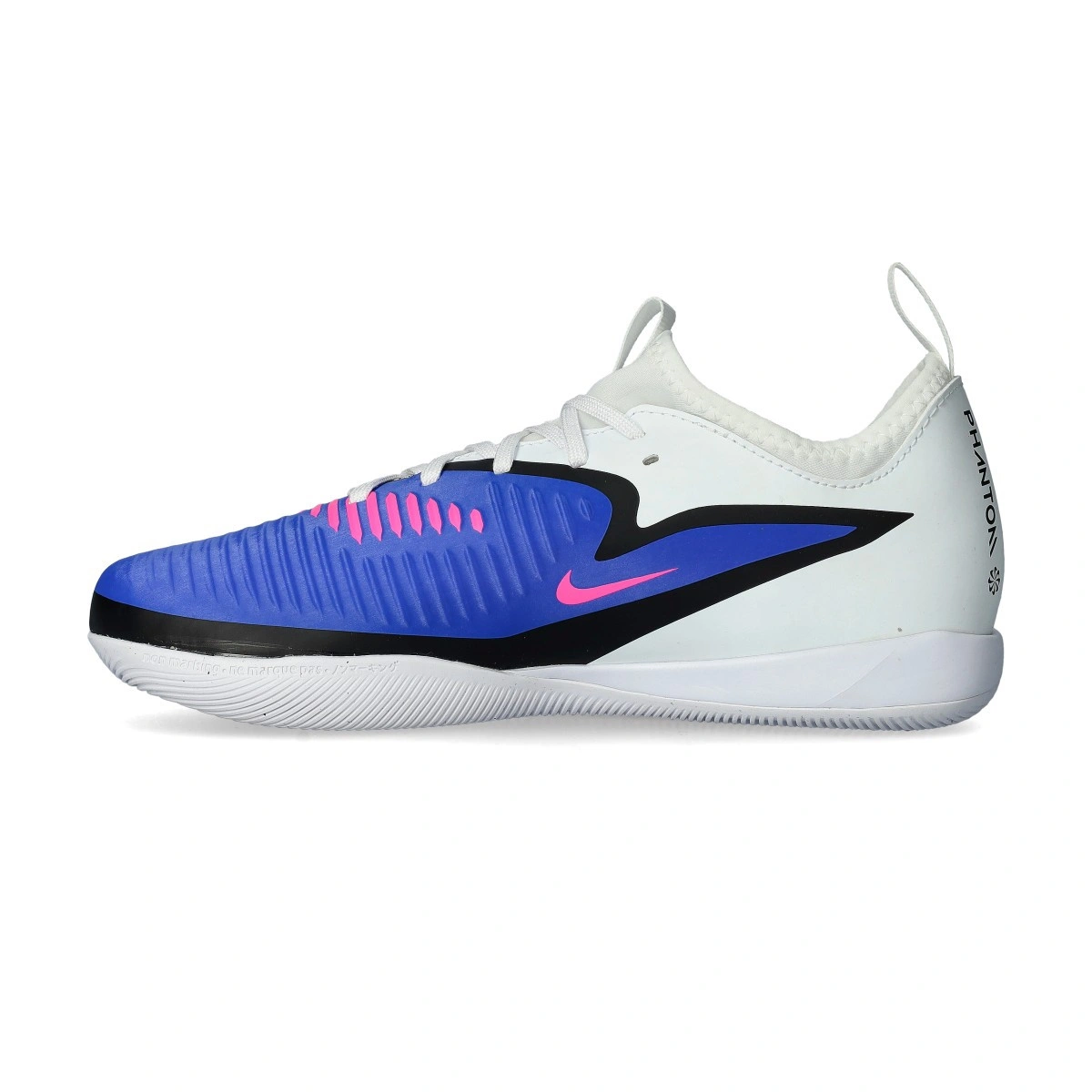 Nike Phantom 6 Low Academy IC Kids futsal shoe. Sockless knit futsal shoe, designed for use on concrete, parquet, or carpet. Mid-range boots for control and precision players in Racer Blue-Pink Blast-White.