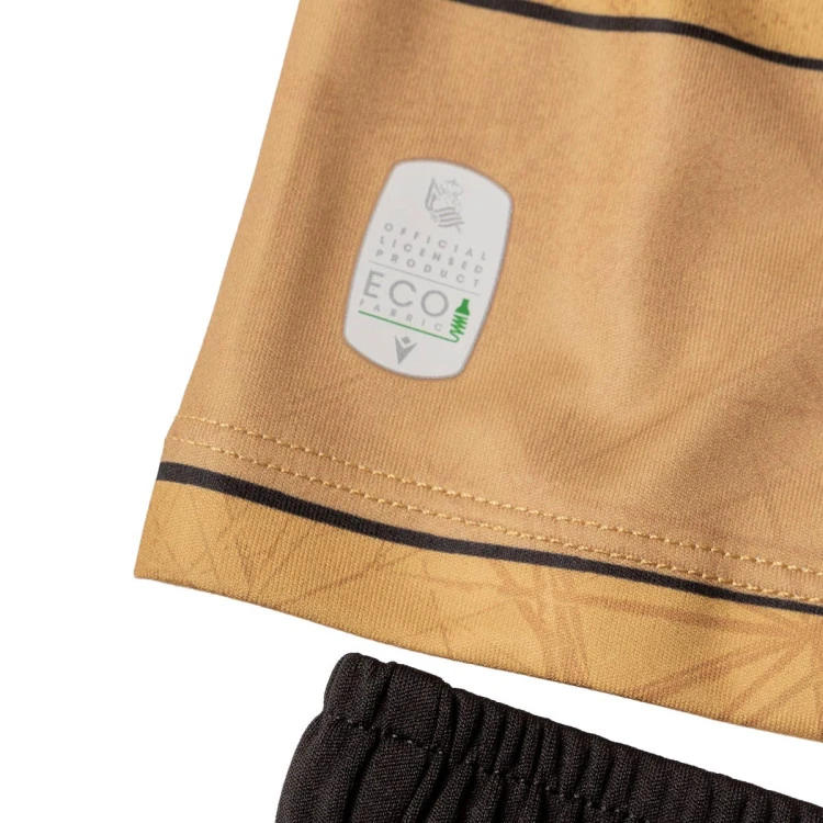 The Real Sociedad Away Kit 2024-2025 for infant. The jersey features horizontal gold-coloured stripes, some with shiny tones and others with matt tones. The dyed graphic accents of one shade over the other create a spray effect image representing the famous stadium roof.