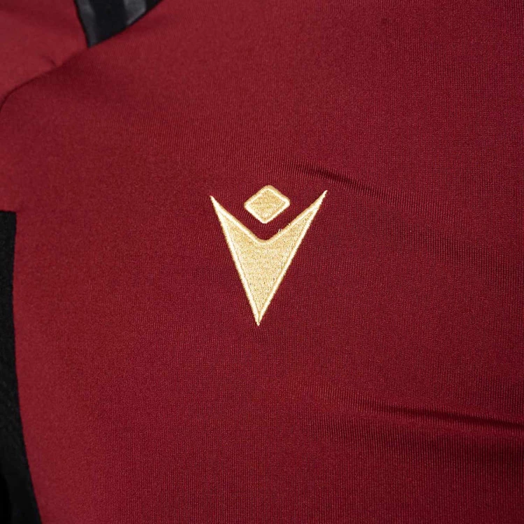 The garment features a burgundy design, with a zip from the centre of the chest to the end of the collar and gold-coloured details.