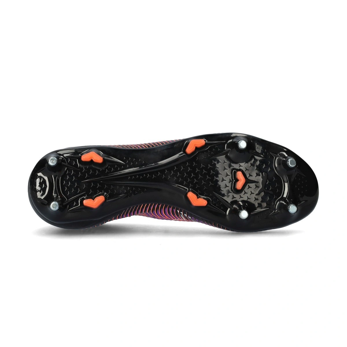 La nueva placa sintética reduce el peso de los tacos sin renunciar a elementos tan importantes como las barras estabilizadoras que encontramos situadas en el puente del pie y que reducen el riesgo de lesión. Destacar la polivalencia de esta placa para obtener un rendimiento óptimo en campos de hierba natural y hierba artificial.