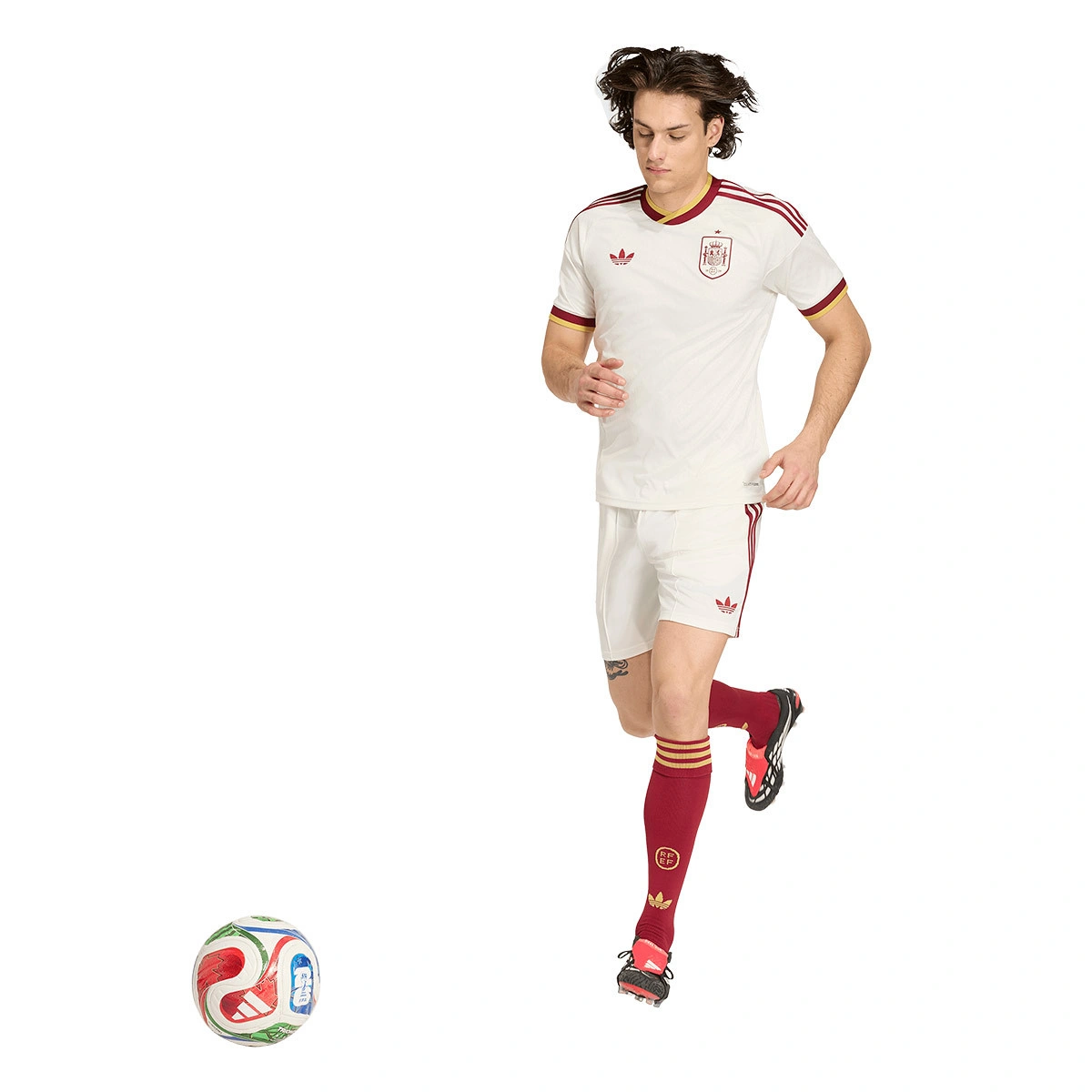 Los pantalones cortos adidas del Segundo Uniforme de España para el Mundial 2026 incorporan detalles de diseño que celebran la riqueza de la lengua española y se inspiran en la elegancia de la literatura clásica.